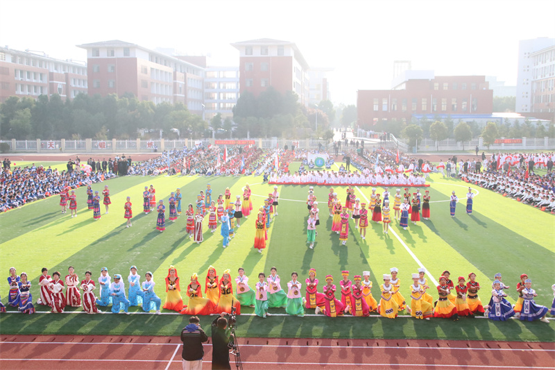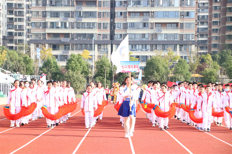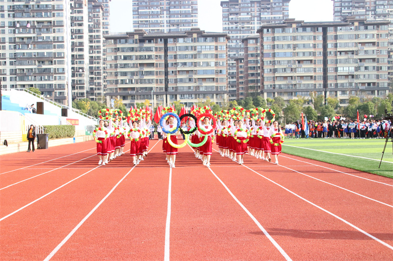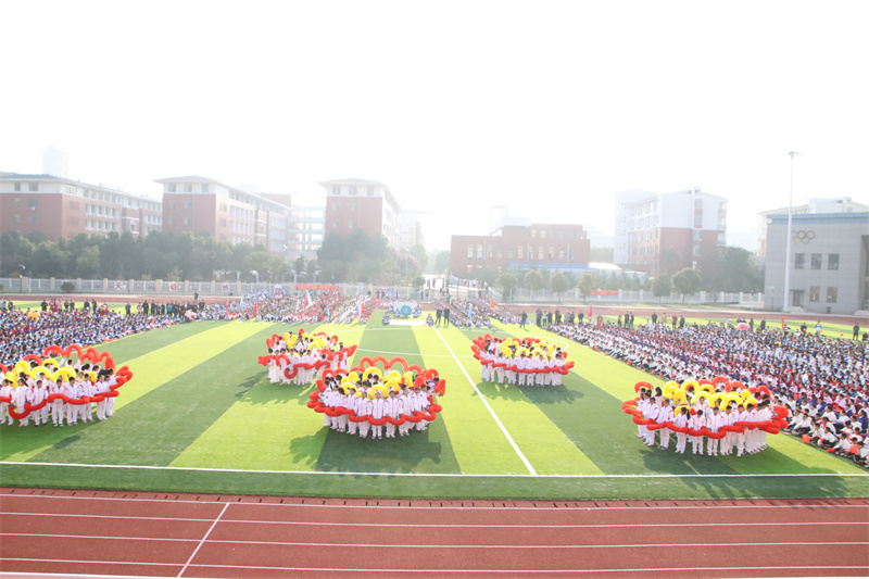 运动会开幕式大型歌舞表演在大家的期盼中上演。在《美丽中国》大型民族舞蹈中,七年级的同学们用优美的舞姿,诠释了56个民族携手同心,共筑“中国梦”,共建美丽中华的勇敢和担当。大型团体操表演《梦之启航》,由200名少年倾情演绎。他们手持三色花环,踏着跃动的音符,伴着音乐的舞步,带来了青春的力量、创造的激情和永不停止的追求。一曲《孤勇者》,让现场的观众又一次被那些用行动传递真情,用奉献书写大爱,用血肉筑牢防线的伟大逆行者所感动。学校庐剧社团的原创节目庐剧表演唱《小小传承人》,展现学校深厚的文化底蕴和社团建设的特色。音乐组老师们带来的歌曲《放歌新时代》,唱出了九中人将青春理想融入国家坐标,以青春之心接续百年荣光的坚定决心和必胜信心。