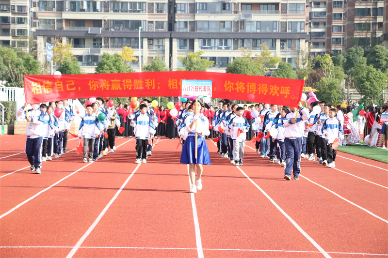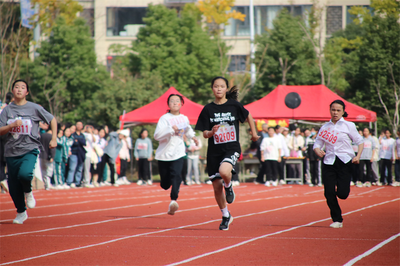 赤红的跑道,九年级运动健儿们如离弦之箭,飞向百米赛道的终点。他们你追我赶,都卯足了劲奋力争先。他们跑出了速度,赛出了水平,他们不断挑战自我,不断超越自我,用行动诠释着自信阳光。