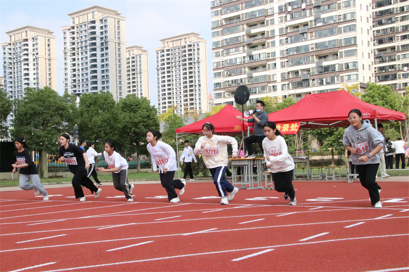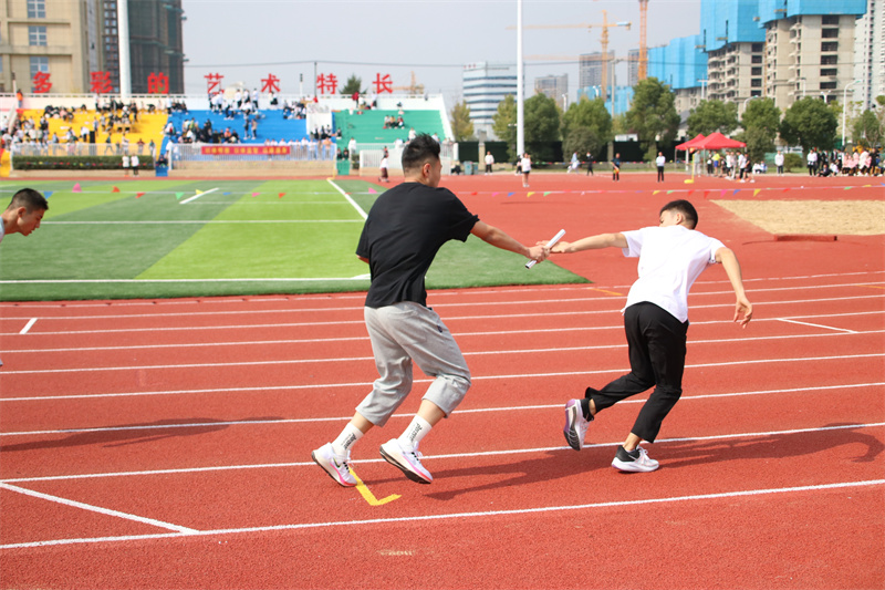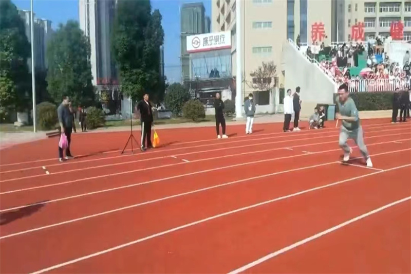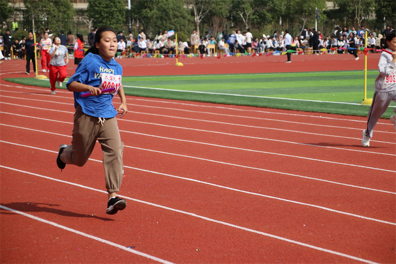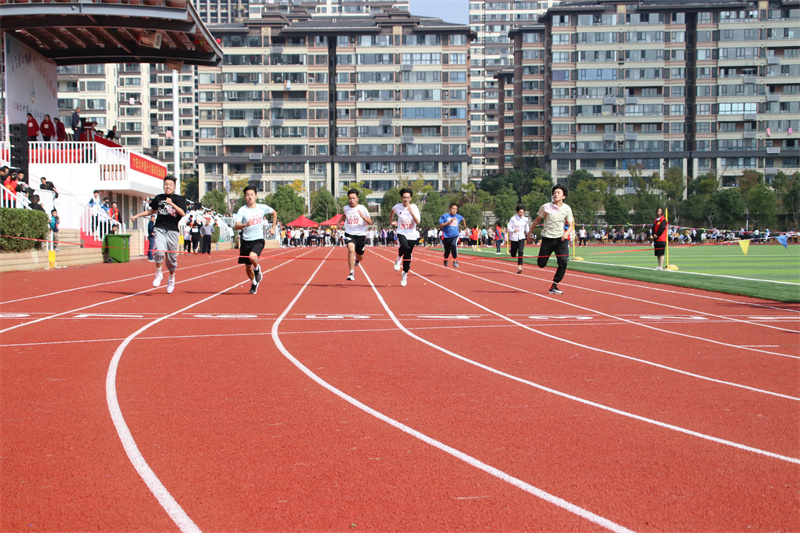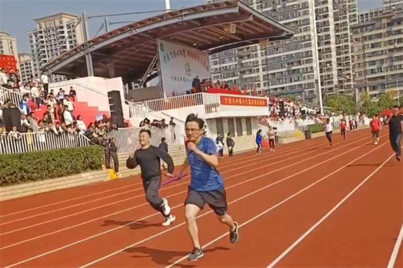 教师组4×100米接力比赛率先开战。起跑、赶超、冲刺,老师们步履如飞、势如破竹。小小的接力棒,传递着团结和默契,传递着无畏与所向披靡的意志。