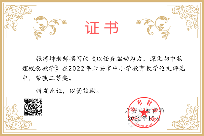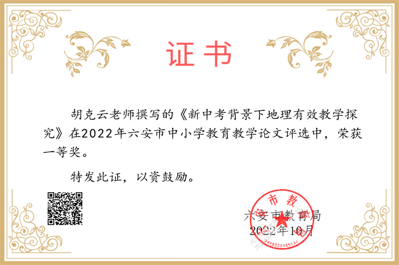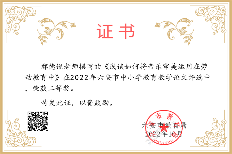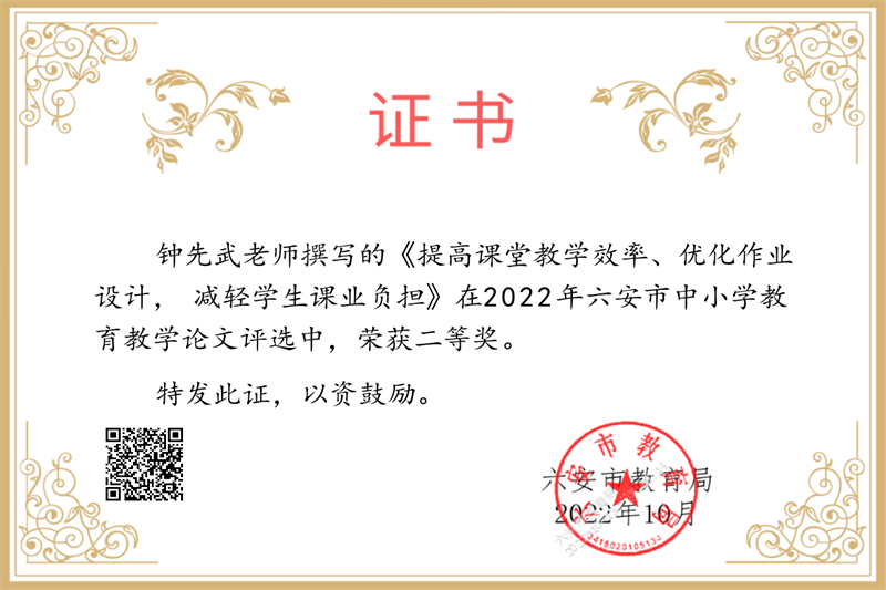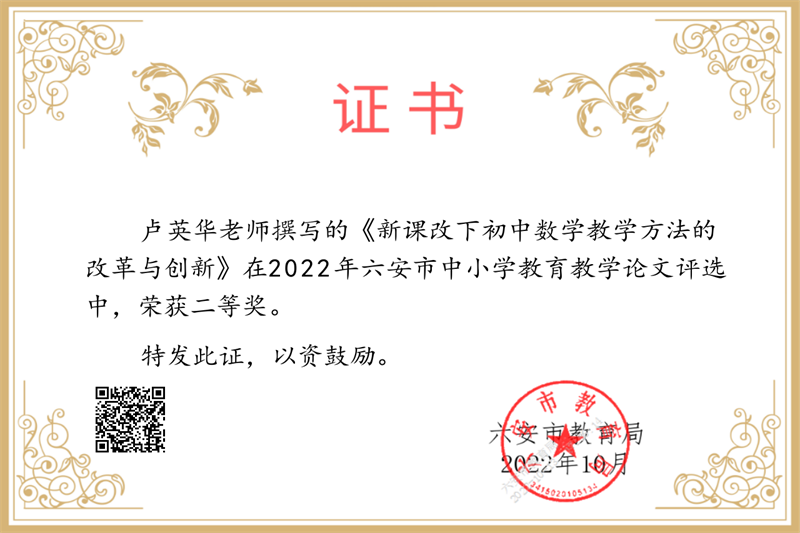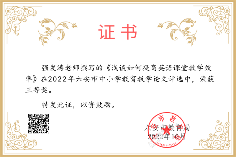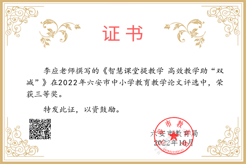 疏篱绕秋丛,笔耕润心田。近日,2022年六安市中小学教育教学论文评选结果揭晓,我校喜获大面积丰收,共27位教师获奖。其中,沈慧琳、刘金华、田兴云、付本立、胡克云、李乃滨、何映月、程学芳、符茂兰、刘国聪等十位老师喜获市级一等奖,卢英华、孙婷婷、田小雨、吴浩、鄢德锐、游捷、张涛坤、张有俊、赵平、钟先武等十位老师获得市级二等奖,程浩、霍晓东、李应、卢文庆、强发涛、荣光林、翁士林等七位老师获得市级三等奖。