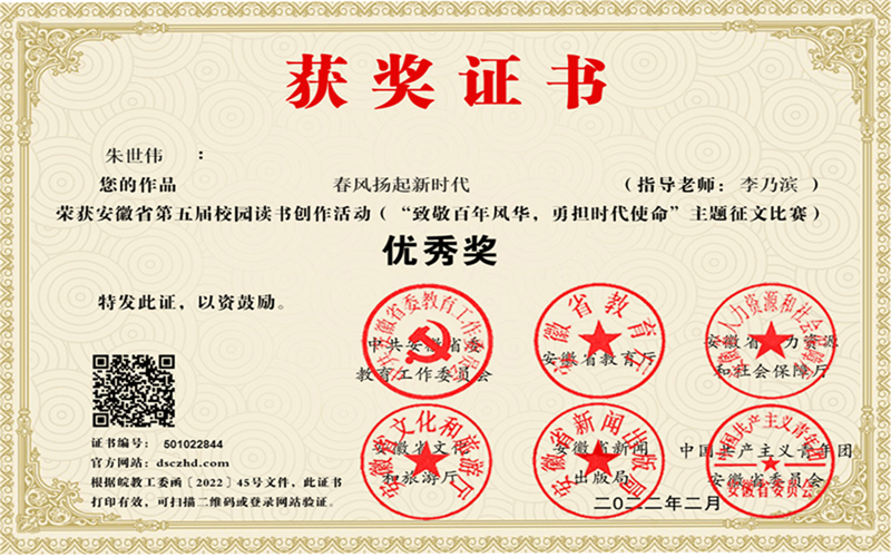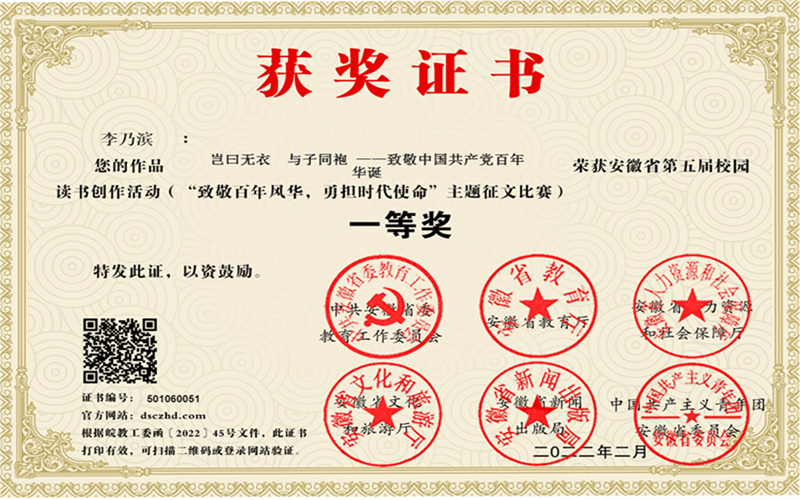 本次活动为以“致敬百年风华,承担时代使命”主题,旨在进一步推动“书香安徽”和校园思想文化阵地建设,践行社会主义核心价值观,弘扬中华优秀传统文化。学校高度重视此项活动,安排校团委组织,开展多种形式的校园读书征文活动,上报30篇参赛作品。经过区、市遴选,省级评审,19人次获奖。其中,查军柱和金梅两位老师荣获“优秀指导老师”奖;李乃滨老师的《岂曰无衣 与子同袍》荣获教师组省一等奖;九(11)班孙晨欣同学的《书香伴我成长》、九(16)班宋诗瑶同学的《自道书中皆师友》荣获初中生组省一等奖;八(21)班李灿同学的《致敬百年风华,承担时代使命》荣获初中生组省二等奖;九(11)班徐京玲同学的《书香伴我成长》、九(15)班刘馨蕊同学的《感谢有你——我精神的摆渡者》、八(14)班朱妍思桐同学《回顾百年征程 牢记青年使命》、九(6)班汤玉慧同学的《做时代的“弄潮儿”》、九(11)班赵雪同学的《重读经典》和九(11)班姚洁羽同学的《书香伴我快乐成长》荣获初中生组省三等奖;同时,还有7位同学荣获初中生组优秀奖。