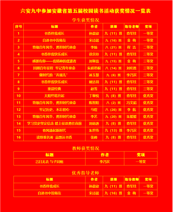 日前,由中共安徽省委教育工委、省教育厅、省人力资源和社会保障厅、省文化和旅游厅、省新闻出版局、共青团安徽省委员会联合举办的“第五届校园读书活动”获奖结果公布,六安九中在此次活动中喜获丰收,共有19名师生获得省级大奖。