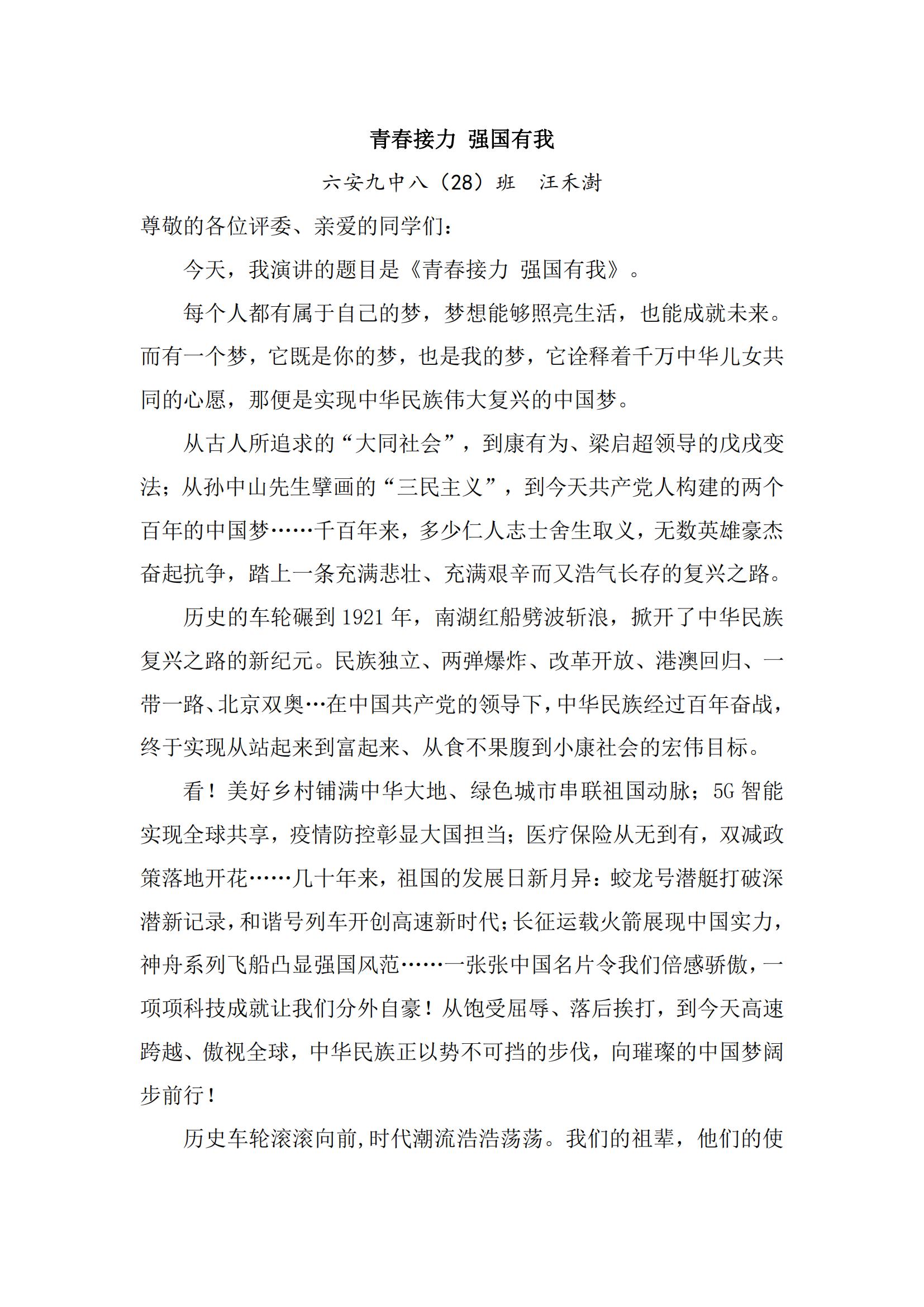 为深入学习贯彻习近平总书记在庆祝中国共产党成立100周年大会上重要讲话精神,进行爱党爱国爱社会主义教育,引导青少年深入践行“强国有我”的青春誓言,培育时代新人,六安九中积极组织2022年“中华魂”主题教育活动,并举行了“新时代好少年·强国有我”主题演讲比赛。接下来,让我们来欣赏选手们的精彩表现吧!