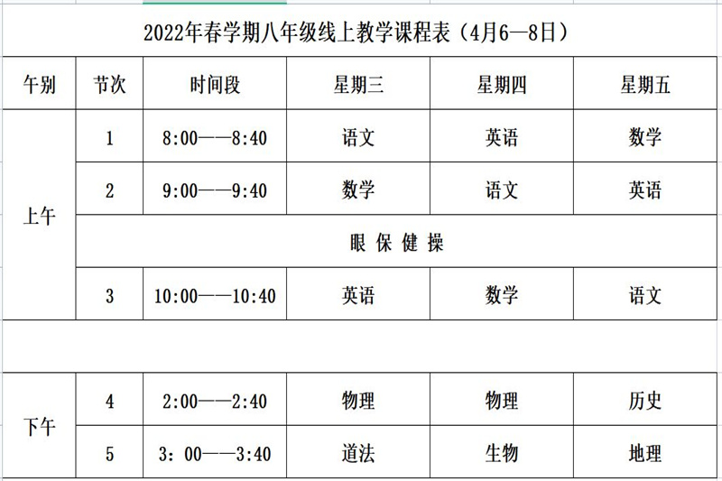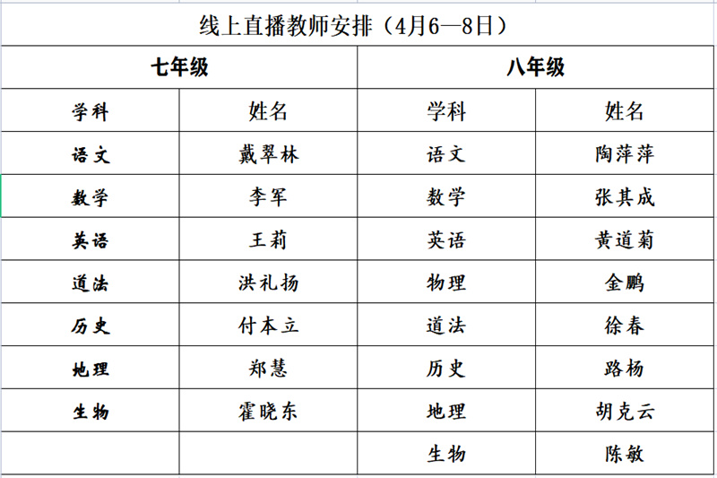 1.七、八年级由学校统一编排课程表,安排专人通过钉钉群为全年级所有班级集中授课。各班授课老师全程参与本学科听课,并做好本班学生的作业批改、线上答疑等工作。