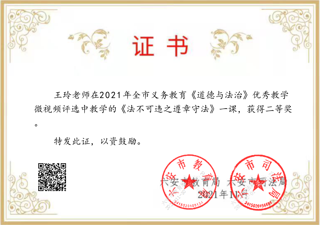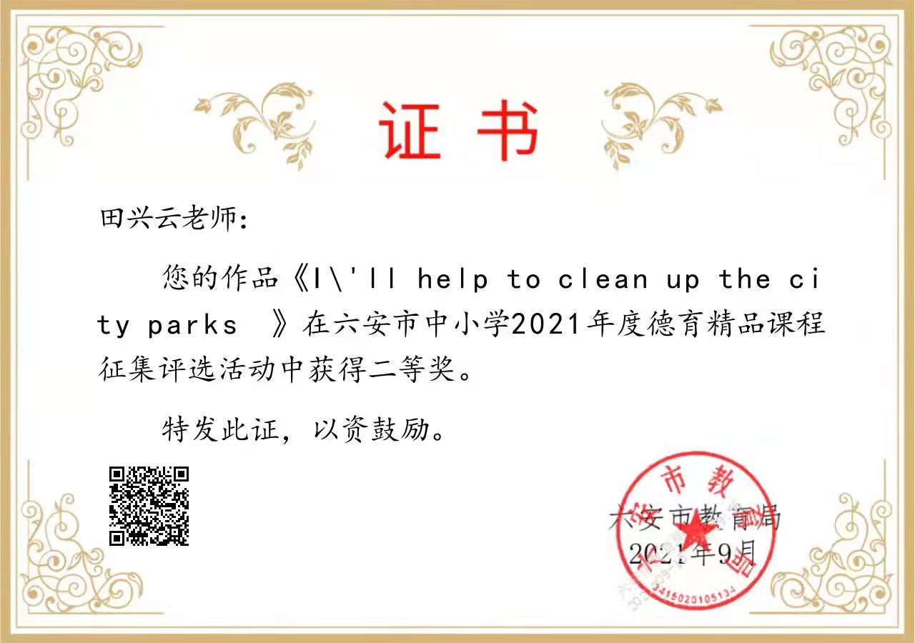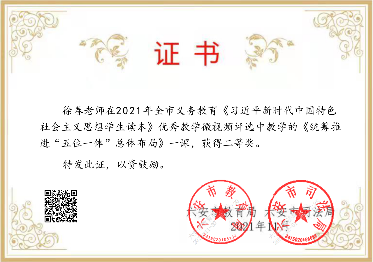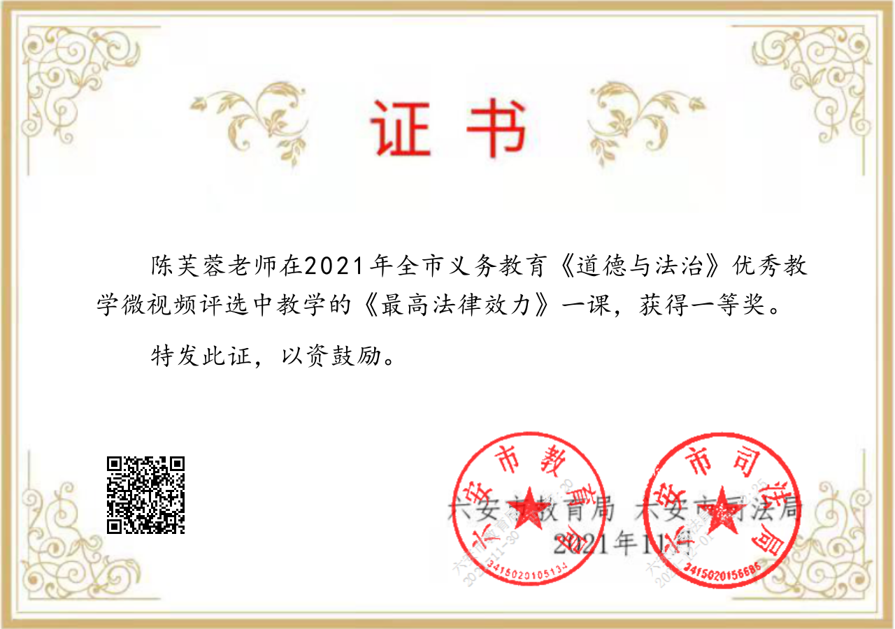 在2021六安市义务教育《道德与法治》优秀教学微视频评选中,陈芙蓉老师《最高法律效力》、谢宜芳老师《有勇有谋 应对违法犯罪》喜获一等奖,徐春老师《统筹推进“五位一体”总体布局》、王玲老师《法不可为之遵章守法》荣获二等奖;“学科德育精品课程”评选中,田兴云老师《I’ll help to clean up the city parks》一课喜获二等奖,“德育主题班队会”评选中,王德玲老师《革命传统教育》荣获三等奖。