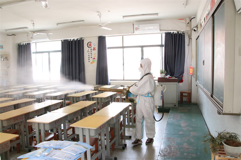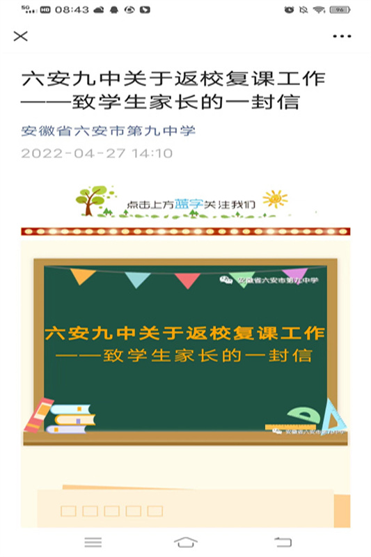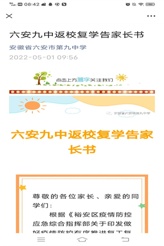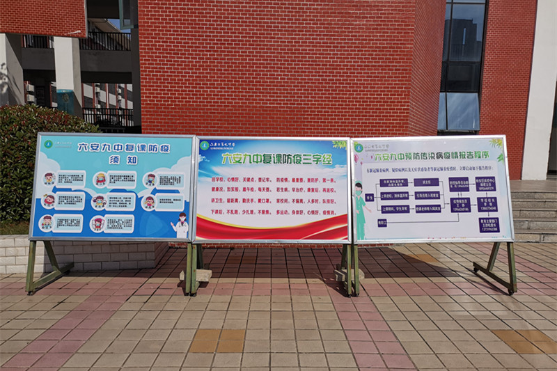 自市防疫指挥部复工复学相关文件下发以来,六安九中高度重视、周密部署、精心组织、狠抓落实,始终以师生生命安全和身体健康为中心,以“五个到位”的原则,统筹做好疫情防控和复工复学工作。一是思想认识到位。学校全体教职员工深刻认识到本轮疫情的复杂性和返校复课任务的艰巨性,团结一心,严阵以待,以强烈的责任心和担当意识,克服一切困难,全力保障返校复课。二是工作部署到位。学校结合实际,提前筹划、精准研判,不断完善疫情防控和返校复课方案及制度,明确分工,定岗定责,严格执行疫情防控工作流程,开展应急推演,做好线上线下教学衔接,确保了返校复课工作顺利进行。三是人员摸排到位。学校建立“学校——年级——班级——家长”四级防控体系,细致查验了学生及同住家长的健康码和行程码,引导家长签订“承诺书”,如实填写“学生健康档案”,建立了“一人一台账”,坚决做到摸排精准、防控到位。四是校园消杀到位。学校已经完成3次全面消毒,同时对门把手、栏杆等重点部位进行细致消毒,做到全面、彻底、不留死角,以有效防止疫情及传染病的出现与传播。五是宣传培训到位。学校制定了详实的“复学第一课”“教职工防疫及突发情况处置”等学习培训方案,在学校大门处放置“复课防疫三字经”“复课防疫须知”“应急处置流程”等展板,电子屏滚动播放疫情防控等宣传标语,通过班级微信群、钉钉群和学校公众号发布“返校复课一封信”“返校复学告知书”等,召开了多场线上家长会,营造了良好的防控氛围,及时向家长、学生和社会各界通报了复学准备情况,引导预期,消除疑虑,回应社会关切。