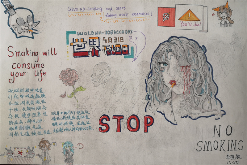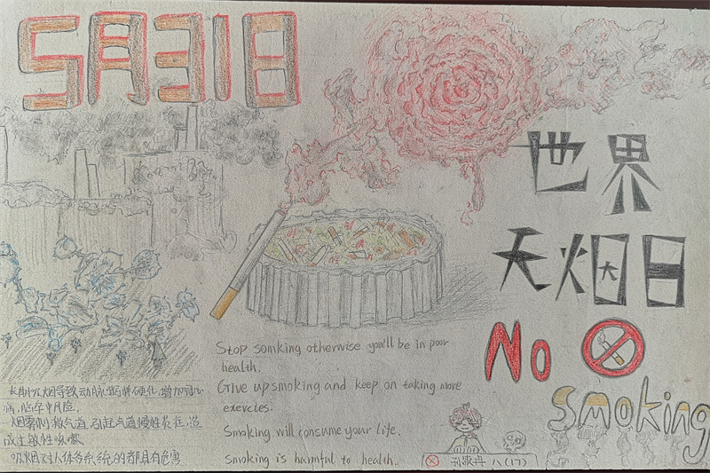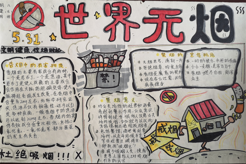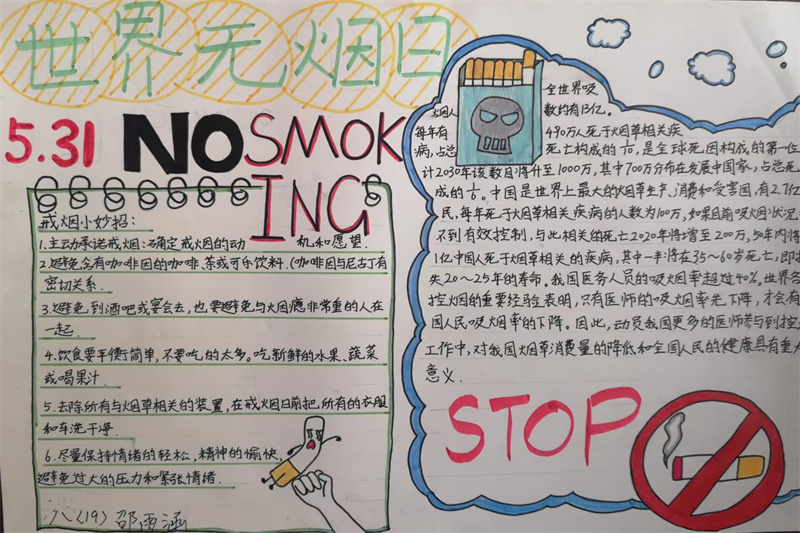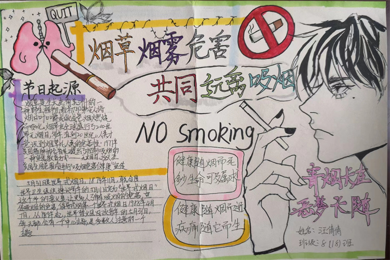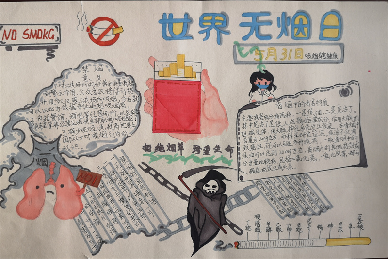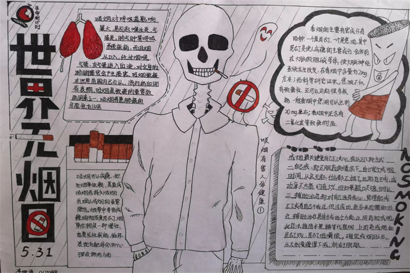 大力宣传吸烟危害。学校通过校园广播、电子显示屏、手抄报等途径向全校师生广泛宣传吸烟以及吸二手烟对身体危害方面的知识。一张张手抄报主题鲜明、设计精美,展示了吸烟的危害,提醒广大师生从现在起,拒绝吸第一支烟、拒绝吸二手烟,倡导大家远离烟草,珍爱生命,助力营造无烟家庭、无烟校园。