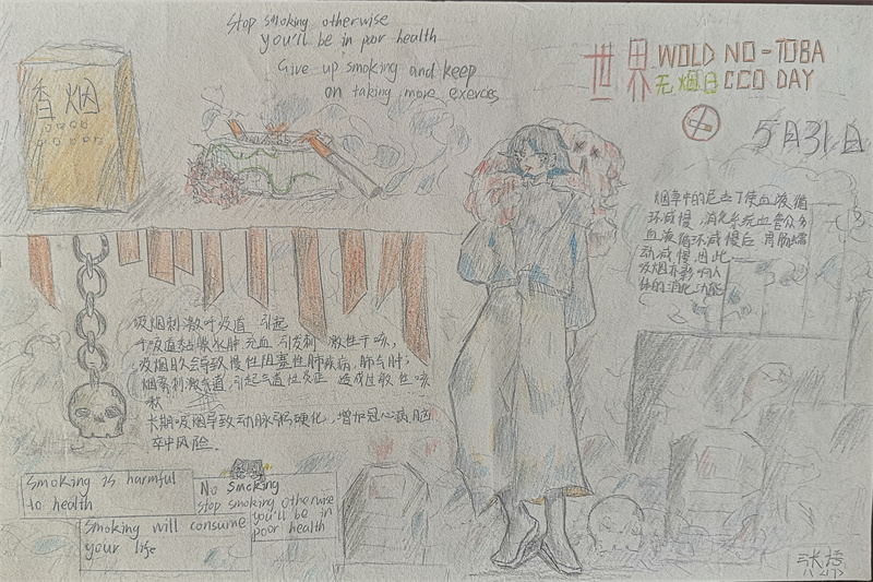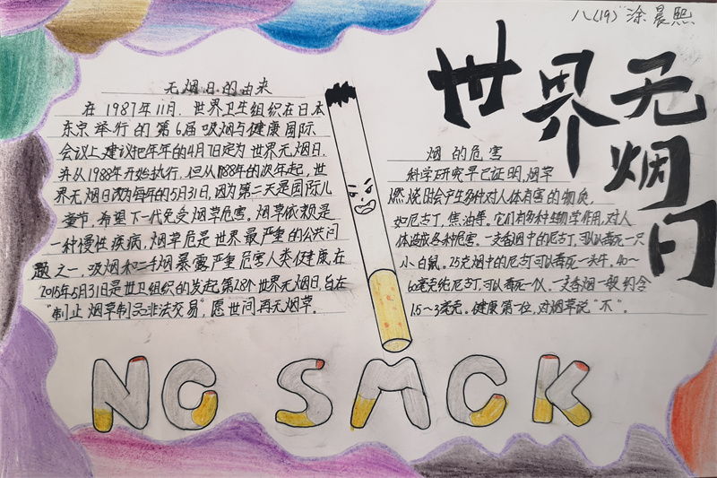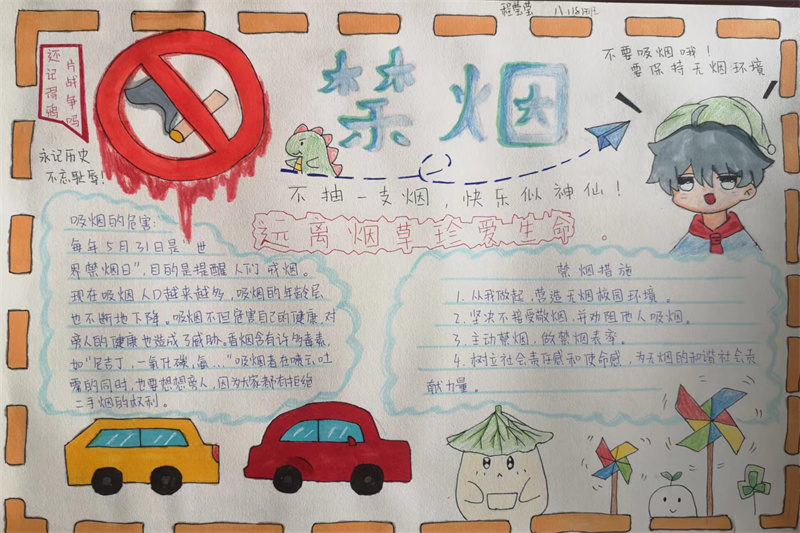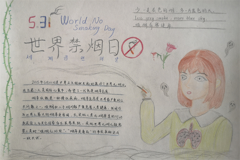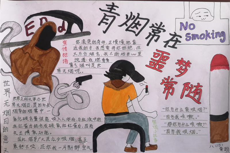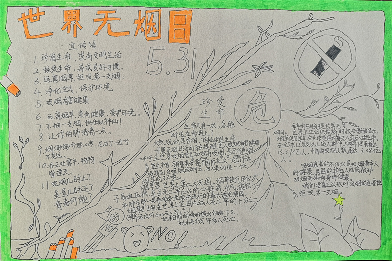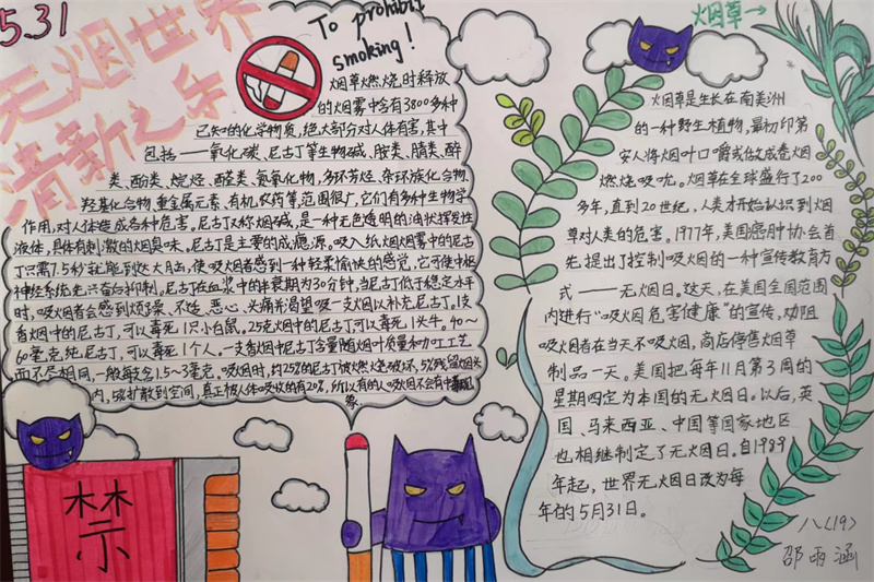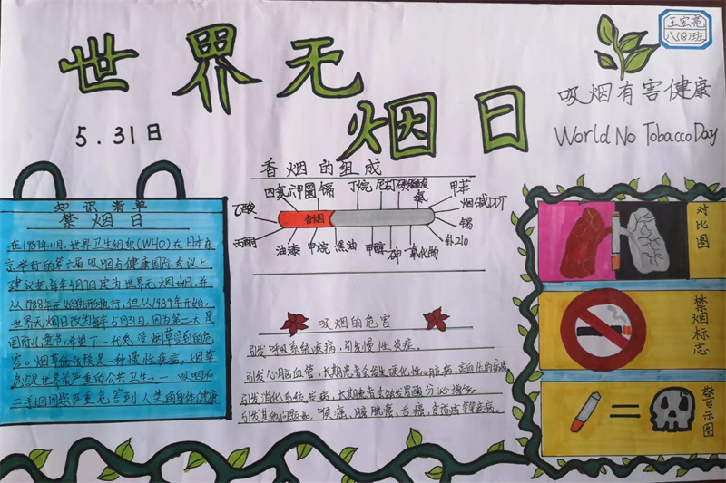 大力宣传吸烟危害。学校通过校园广播、电子显示屏、手抄报等途径向全校师生广泛宣传吸烟以及吸二手烟对身体危害方面的知识。一张张手抄报主题鲜明、设计精美,展示了吸烟的危害,提醒广大师生从现在起,拒绝吸第一支烟、拒绝吸二手烟,倡导大家远离烟草,珍爱生命,助力营造无烟家庭、无烟校园。