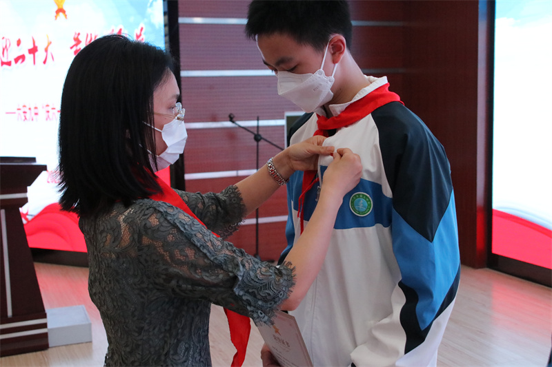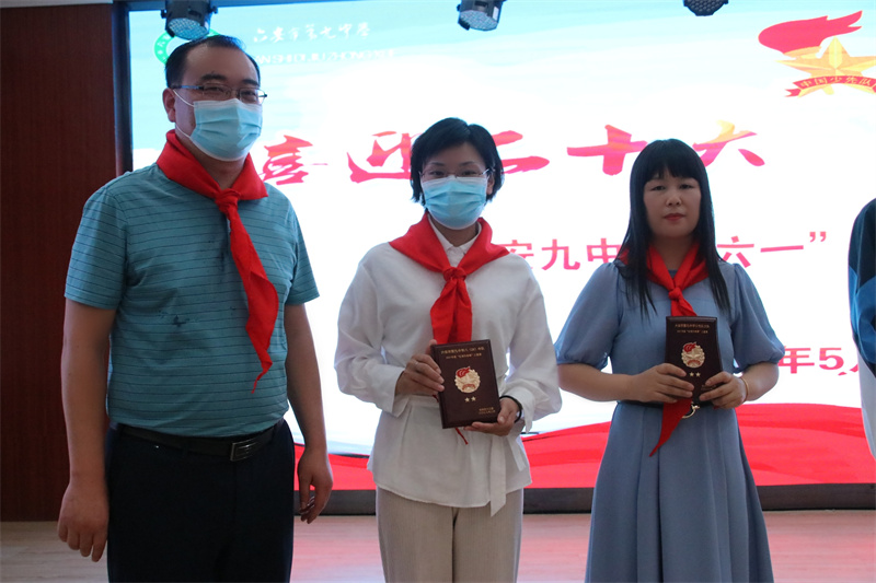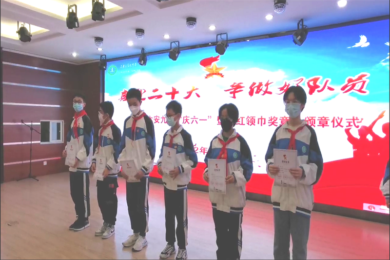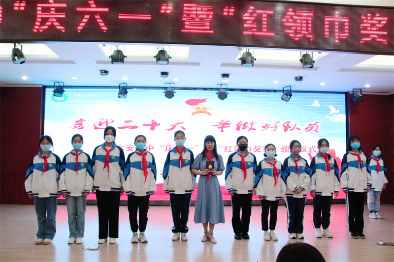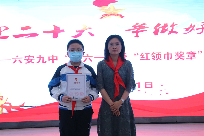 学校少工委副主任、团委书记刘伦胜宣读了六安九中2022年“红领巾奖章”个人一星章表彰决定和荣获2021年度“红领巾奖章”二、三、四星章的个人和集体名单。学校校长、少工委主任李艳及与会领导为获章的少先队辅导员和少先队员颁发证书和奖章。