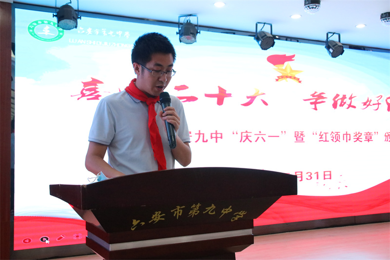 为迎接党的二十大胜利召开,全面贯彻落实《中共中央关于全面加强新时代少先队工作的意见》精神,激发少先队员门的爱国情怀,增强少先队员们的光荣感和使命感,5月31日下午,六安九中举行“庆六一”暨“红领巾奖章”颁章仪式。