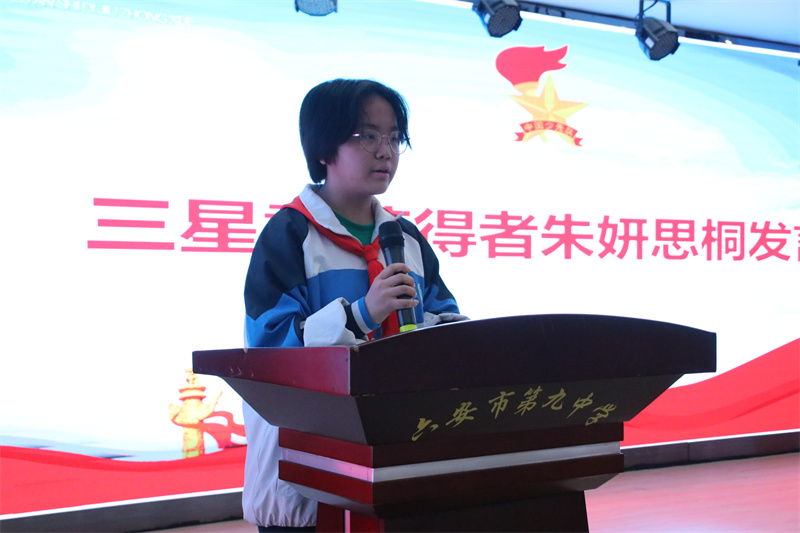 荣获“红领巾奖章”三星章队员代表、八(14)中队队员朱妍思桐发表获章感言。她表示,作为社会主义事业的建设者和接班人,将一如既往的听党话跟党走,做好表率带头作用,严格要求自己,再接再厉,争创新的佳绩。