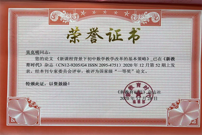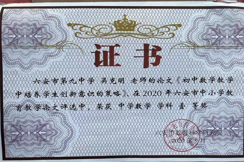 吴克明 市优秀教师,参加市教师基本功大赛获全能二等奖、市初中数学优质课大赛获二等奖,多次获得区教学成果奖。