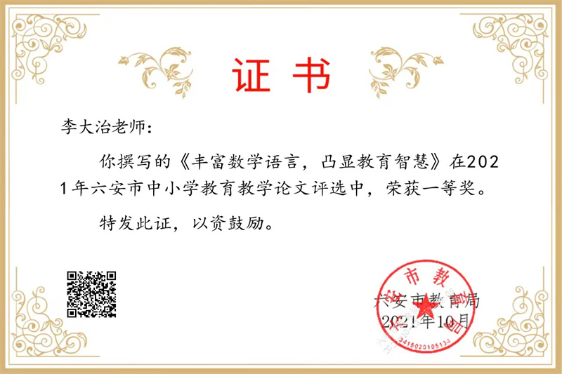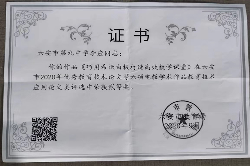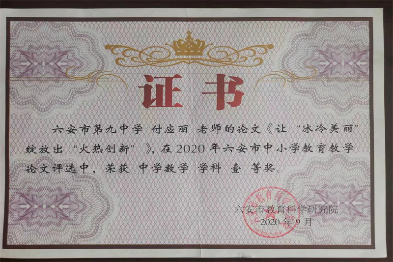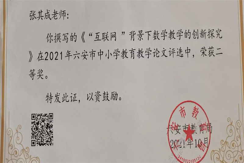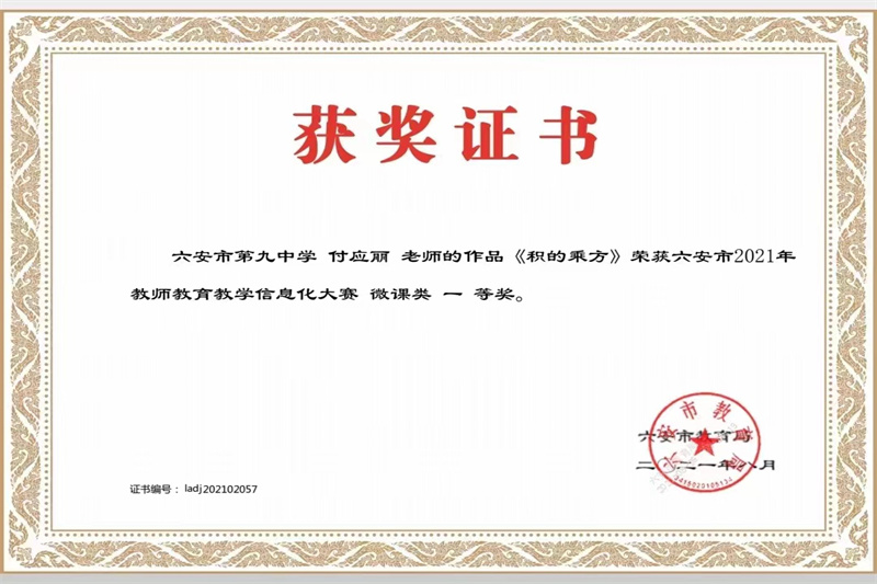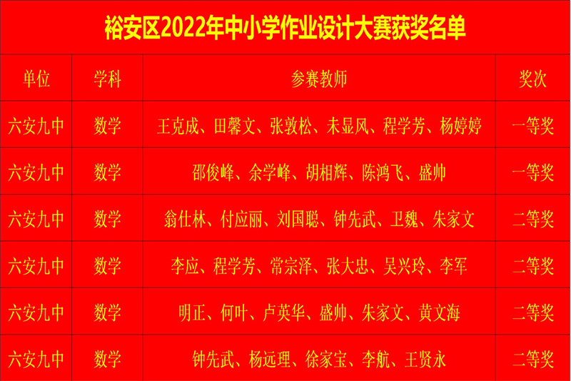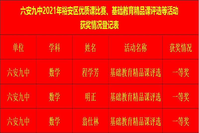 六安九中数学教研组是一支教育理念新、教学业务精、全员求合作、共同谋发展的创新型团队。数学教研组赓续九中“重师德、练师能、铸师魂”的传统,推选教师参加优质课、精品课大赛,让他们在更大的平台展示自我,体验专业成长的快乐。他们齐心合力,潜心教研,取得骄人的成绩,多人在各级各类比赛中屡获佳绩。近年来,获国家级比赛奖项1人,省级比赛奖项12人,市级比赛奖项25人,区级比赛奖项45人。