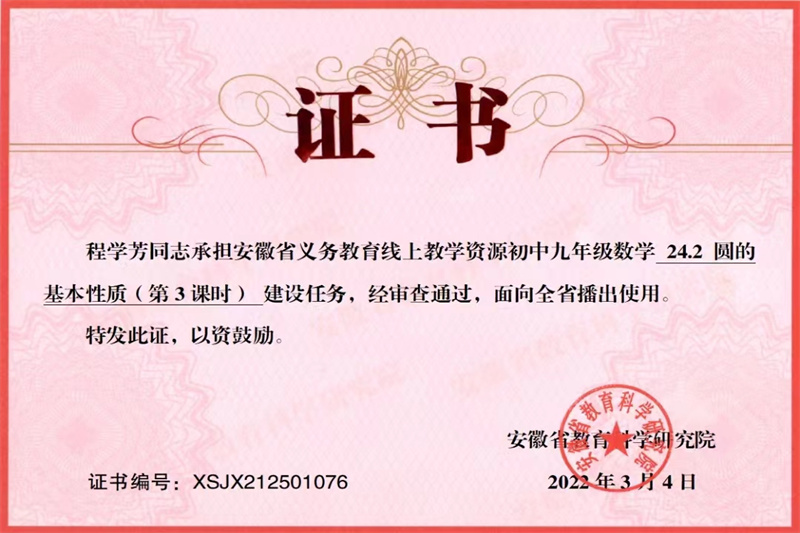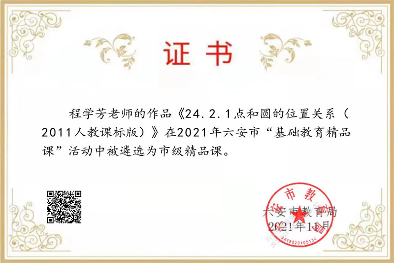 程学芳 市教坛新星,区师德先进个人,六安市李胜名师工作室核心成员,参加市初中数学优质课大赛获二等奖。