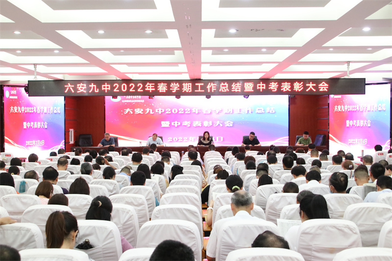 伴随着岁月匆匆的脚步,承载着勤奋耕耘的喜悦,六安九中全体教职工通力合作,初心如磐,笃力奋楫,圆满完成了本学期教育教学工作任务,取得了辉煌的成绩。为了更好地总结与反思本学期工作情况,完善学校管理工作,展望新学期工作思路,7月4日上午,六安九中校长李艳主持召开学校2022年春学期工作总结暨中考表彰大会。全体教师齐聚一堂,总结过往,展望未来。