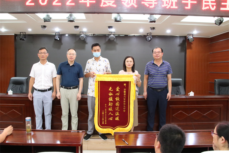 7月18日上午,六安九中2021级(8)班梁明坤同学家长来到学校,献上写有“爱心校园送温暖,无私援助暖人心”的锦旗,以表达对学校全体师生给予梁明坤同学无私帮助和爱心募捐的感激之情。校长李艳代表学校从梁明坤父亲手中接过了锦旗,并鼓励梁明坤家人坚强起来,祝愿梁明坤同学早日康复,健康成长。