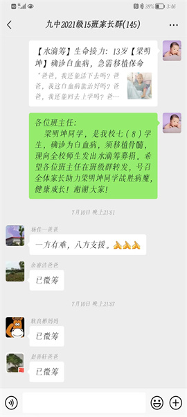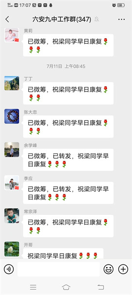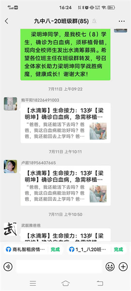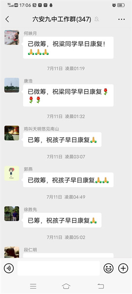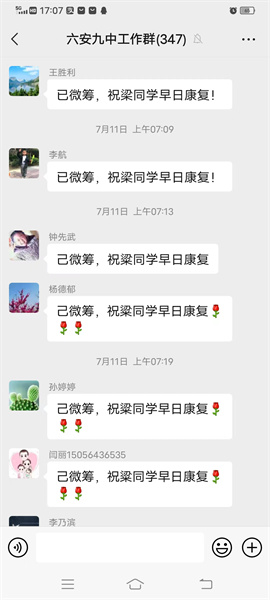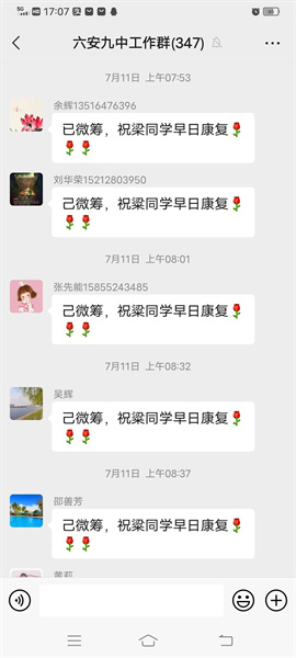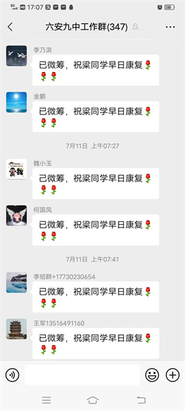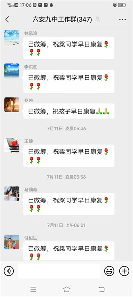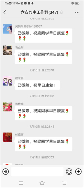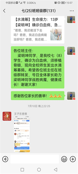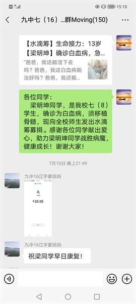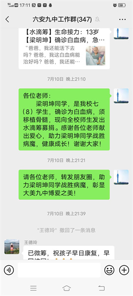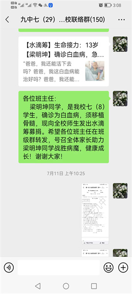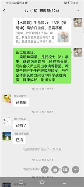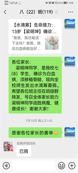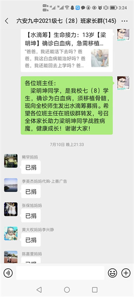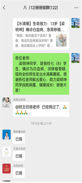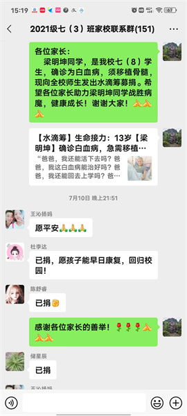 在得知梁明坤同学的病情后,我校校长李艳指示尽快为梁明坤同学募捐并率先捐款,一场声势浩大的爱心捐助行动在校园内迅速开展起来,广大师生纷纷通过水滴筹为梁明坤同学捐款献上一份爱心。在学校工作群和各班级微信群中,一幕幕温暖的画面令人感动,一句句暖心的祝福传递真情。短短几天,全校师生及家长为梁明坤同学捐款累计金额达101257元。