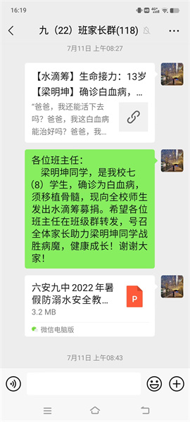病魔无情,校园有爱。六安九中是一个温暖的大家庭,帮助梁明坤同学战胜病魔、重返校园是九中师生共同的心愿,全校师生用实际行动诠释了人间大爱,共同谱写了一曲爱的乐章。我们相信,有全体师生的关心与帮助,有社会各界的关注和支援,梁明坤同学一定能战胜病魔,回到美丽的校园、温馨的课堂。(文:杨传广)