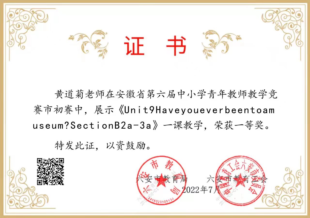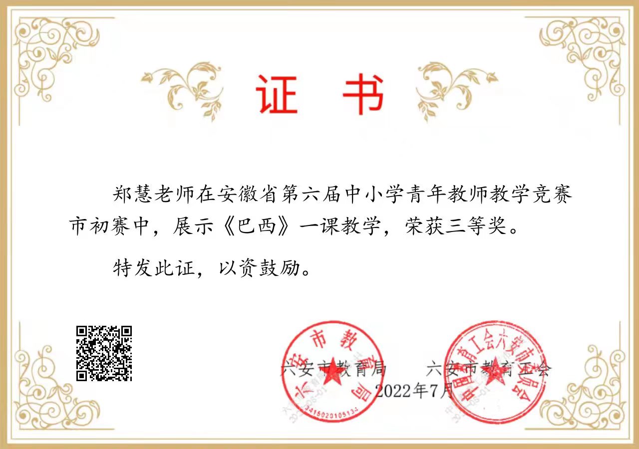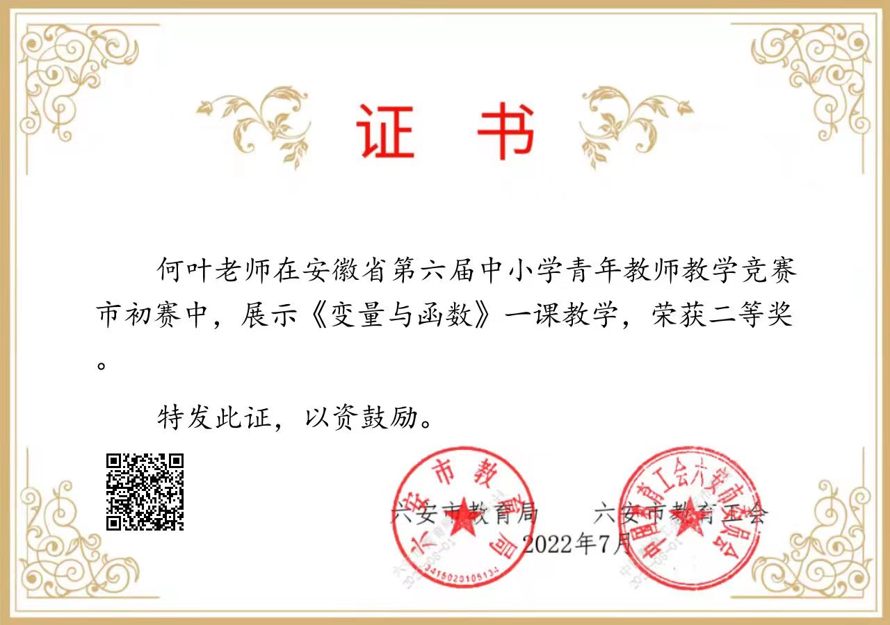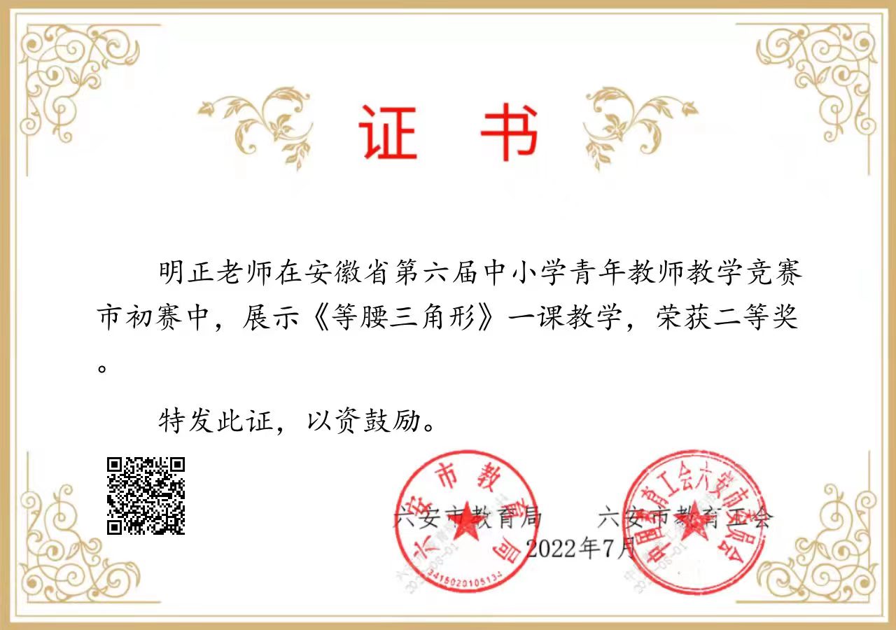 向阳风荷一一举,竞赛逐梦青云上。近日,安徽省第六届中小学青年教师教学竞赛市初赛结果揭晓,六安九中喜获佳绩。我校青年教师陈露、黄道菊荣获市一等奖,明正、何叶荣获市二等奖,郑慧荣获市三等奖。