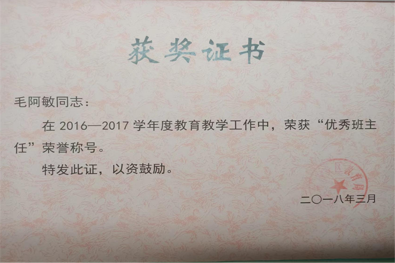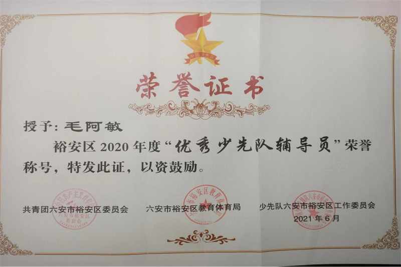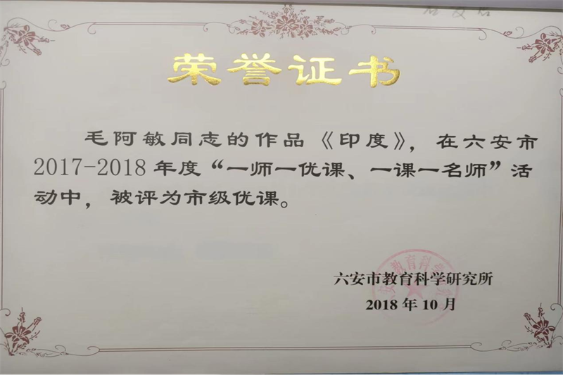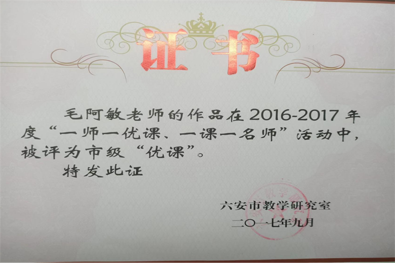 毛阿敏 区优秀班主任、优秀少先队辅导员,参加区初中地理优质课大赛获一等奖,执教的课例在“一师一优课、一课一名师”评选活动中被评为市级“优课”,撰写的家教论文获区一等奖。