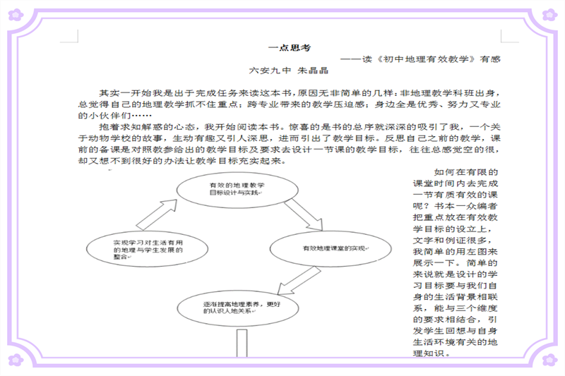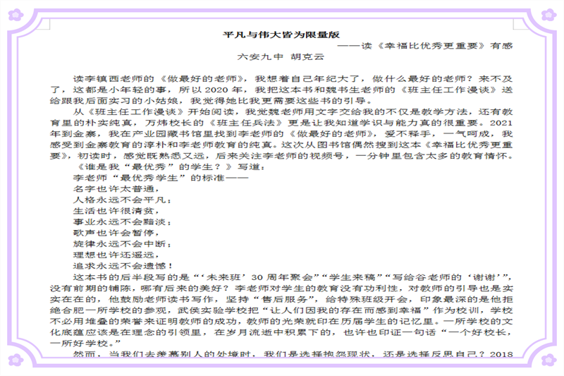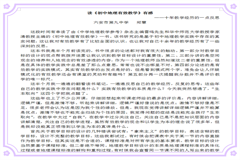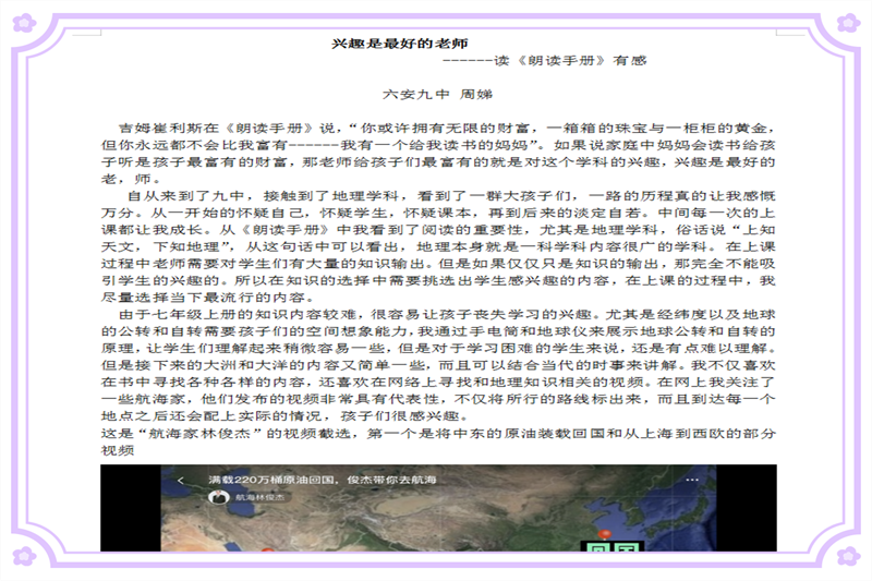 同时,教研组还组织教师开展阅读教育名家著作活动,感受名家的风采,反思自己的教学,撰写阅读心得,让自己的教学更有灵性,富有特色,促进专业成长。