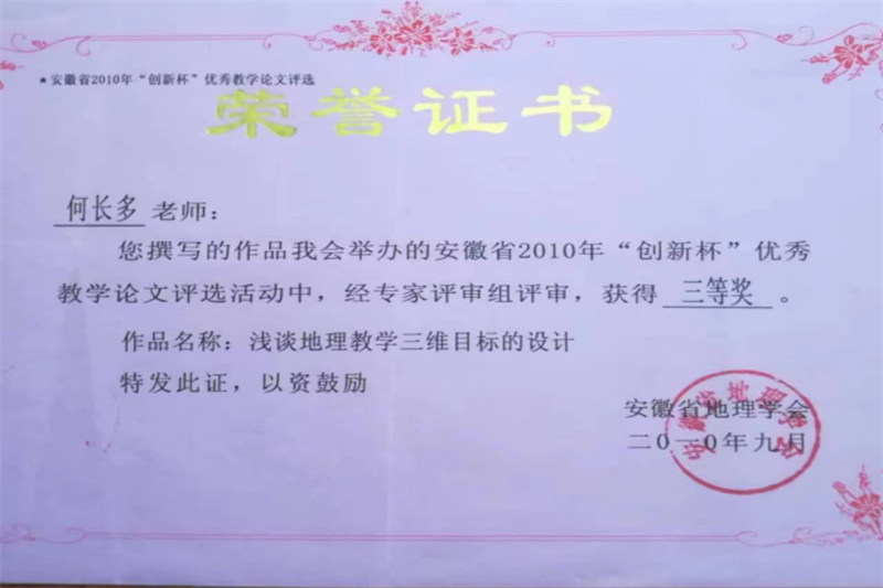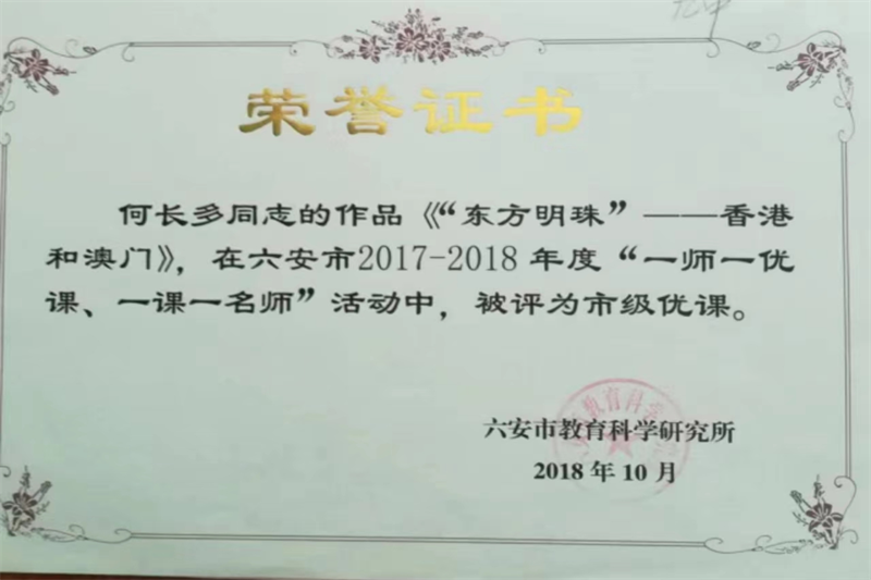何长多 执教的课例在“一师一优课、一课一名师”评选活动中获市级“优课”,撰写的论文在教育教学论文评选活动中获区一等奖,省三等奖。