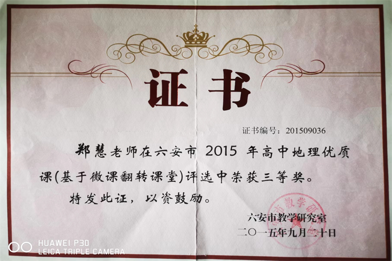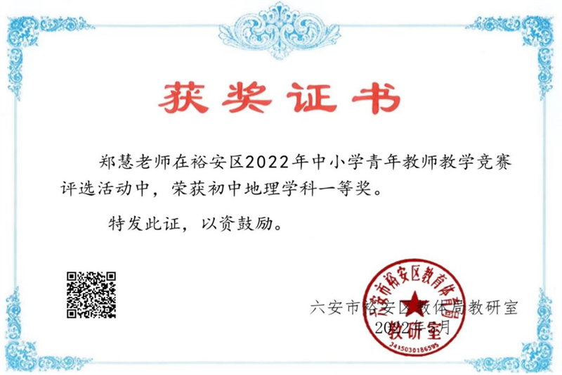 郑 慧 参加省第二届中小学微课大赛获三等奖,市中小学教师教育教学信息化大赛获二等奖,市优质课大赛获三等奖,区中小学青年教师教学竞赛评选活动获一等奖。