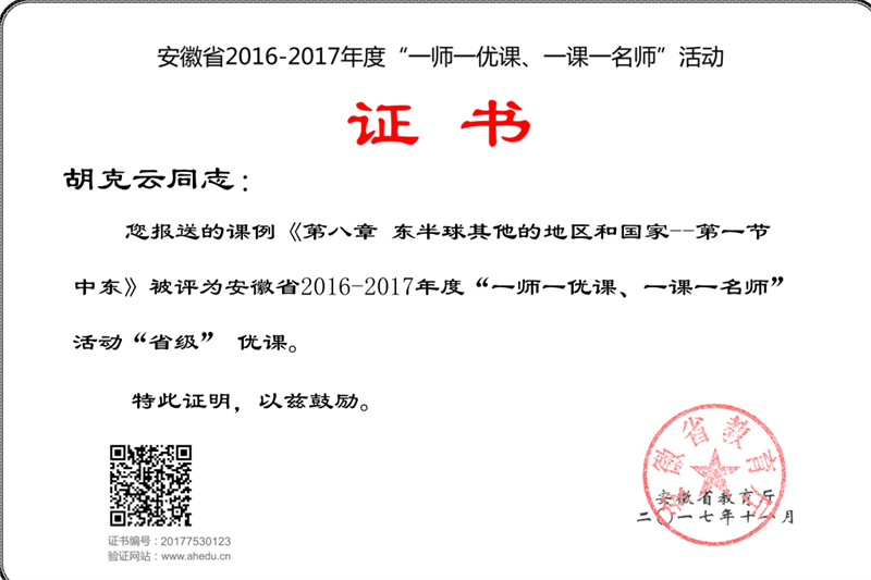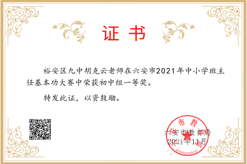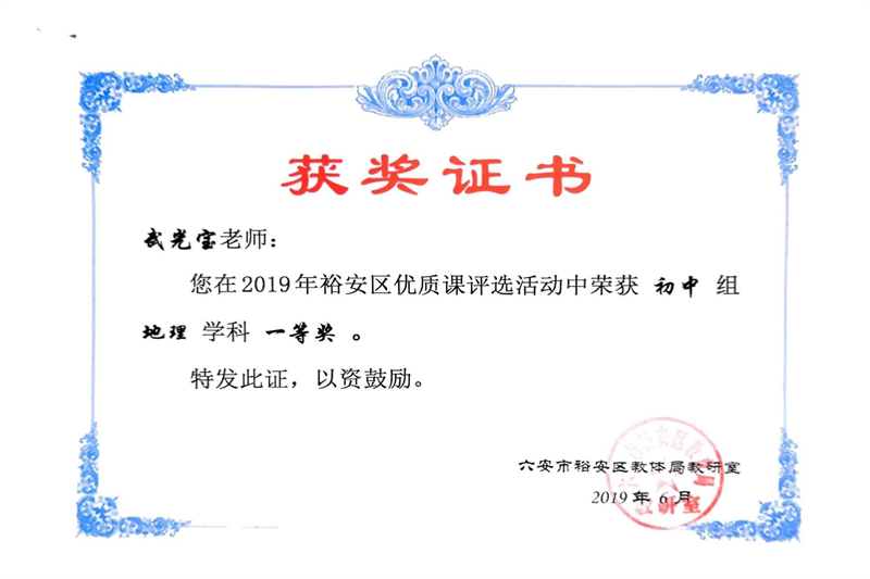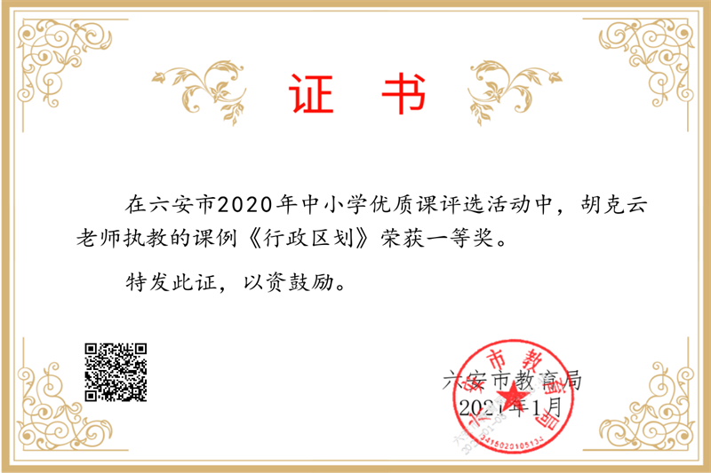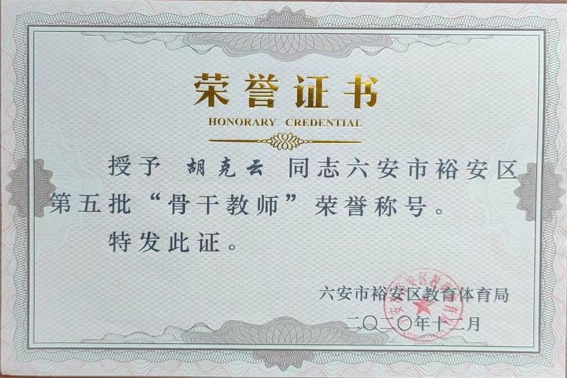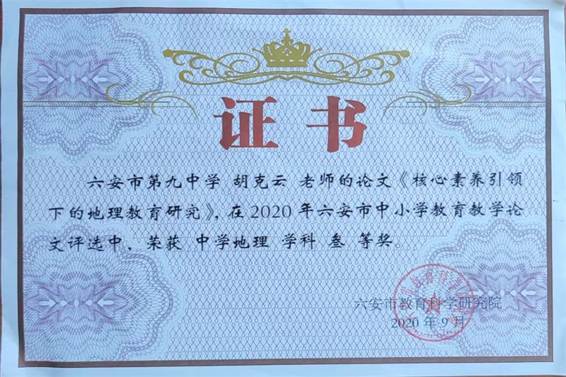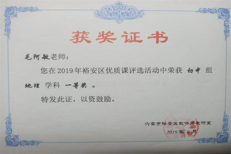 胡克云 地理组教研组长、区模范教师、骨干教师,参加省教育教学信息化大赛获一等奖;参加区班主任基本功大赛获一等奖,并代表裕安区参加六安市比赛获一等奖;执教的课例在市中小学优质课评选中获一等奖。