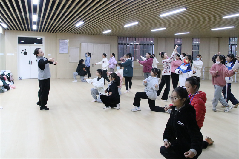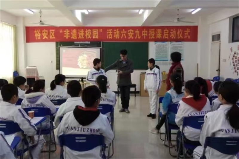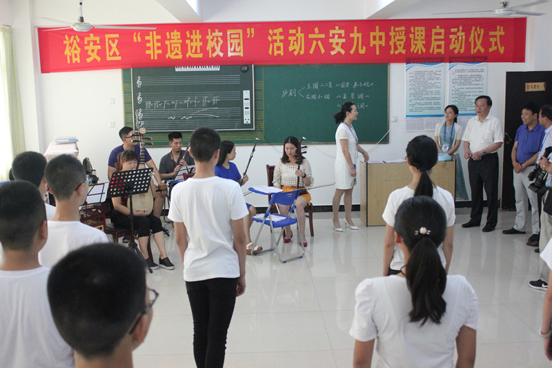 六安九中自成立庐剧社团以来,得到市、区政府和市、区教体局的大力支持,学校长期和区文化馆合作,聘请国家级非物质文化遗产传承人武克英老师,省级非物质文化遗产传承人白树龙老师,合肥市庐剧院院长、国家一级演员段婷婷老师亲临指导,传经送宝;每周三、五下午及寒暑假邀请六安市皖西演艺公司(原六安庐剧团)的专业老师上门送教,传授唱、念、做、打基本功,讲解每一个动作,每一句唱腔。同时,学校加强庐剧社团教师队伍建设,提升社团教师专业素养,培养了一批能在校内承担庐剧教学的骨干教师。目前,学校拥有校内外专兼职教师12人,为学校传承庐剧工作提供了有力的基础保障。专家老师们的专业指导、倾情授课,引领学校传承庐剧工作不断发展,掀起了一股传承传统文化、学唱庐剧的浪潮。