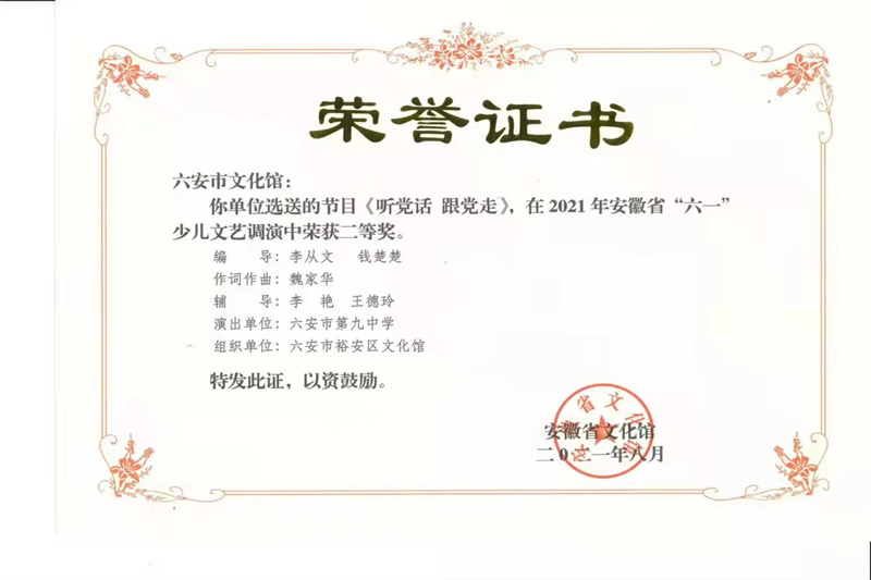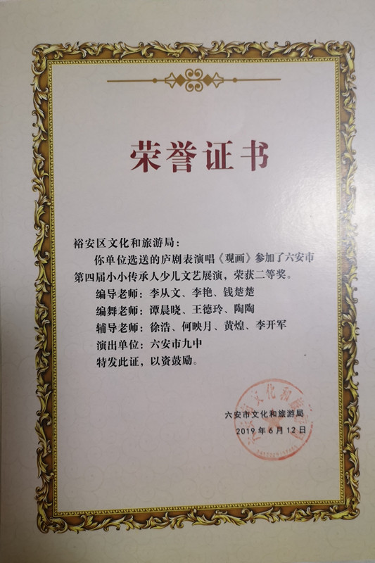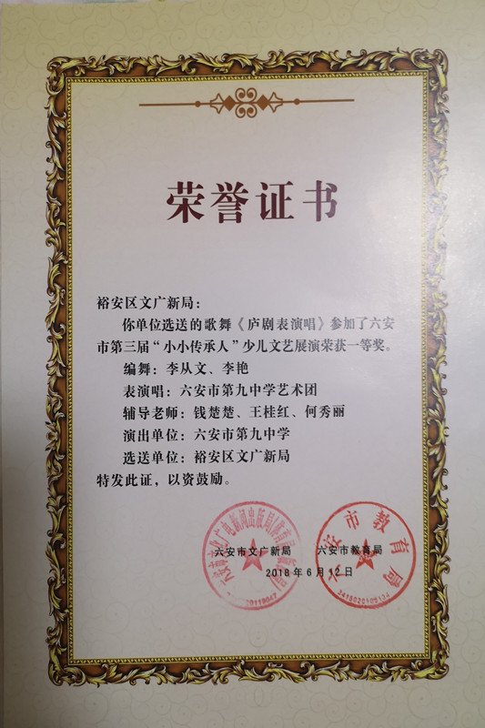一份耕耘,一份收获。我校的编排庐剧节目多次获得省、市大奖,并多次登上市、区春晚大舞台。2018年6月,《我是小小传承人》在六安市第三届“小小传承人”少儿文艺展演中荣获一等奖,并代表六安市参加安徽省“戏曲进校园”汇报演出,登上了安徽卫视相约花戏楼栏目。2018年5月,全国政协副主席卢展工在六安九中调研时,观看了庐剧社团小演员们的精彩表演,对我校传承庐剧方面取得的成绩给予了高度的评价。2019年6月,庐剧表演唱《观画》在六安市第四届“小小传承人”少儿文艺展演中荣获第二名。2021年7月,为“献礼百年华诞”创作的庐剧表演唱《听党话、跟党走》在安徽省“六一”少儿文艺调演中荣获二等奖,在六安市第七届中小学艺术节展演荣获一等奖,并且参加区庆祝建党100周年汇报演出。在刚刚结束的六安市第七届“小小传承人”少儿文艺展演中,庐剧表演唱《茶谷新歌》荣获第三名。