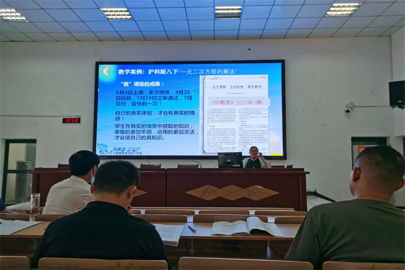 第二阶段中,学校邀请到安徽省特级教师、合肥市初中数学学科带头人、合肥46中学王敏敏老师做专题报告。她对新课标的主要依据、重要性、育人总目标、核心素养等方面进行了解读;然后,介绍新课标的变化以及其中渗透的新理念、新思想;随后,王老师重点介绍了她对数学学科的整体性理解,以及基于新课标的初中数学大单元教学的设计实例,为我们以后的教学实践及理论研究提供了参考。