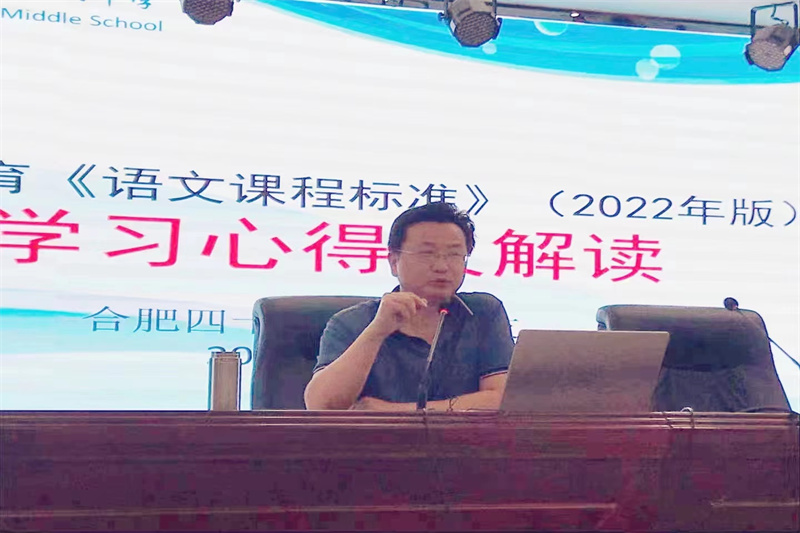 第二阶段中,合肥市骨干教师、包河区初中语文学科带头人、合肥46中申长友老师解读《义务教育语文课程标准》(2022年版)。讲座中,申老师对比了2011年版与2022年版课标五个方面的变化,通过具体课例谈了对这些变化的解读和在语文教学实践中的操作;并指出,教师要依据课标,用好教材,选好文本,科学组合,才能实现学生语文核心素养的真正培养和提升。