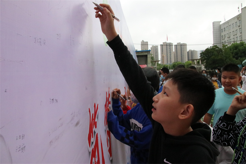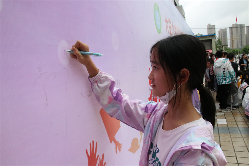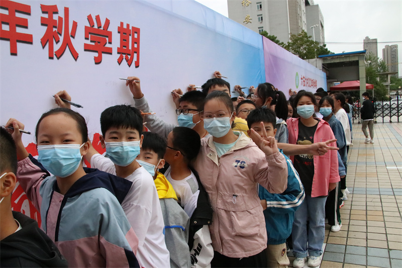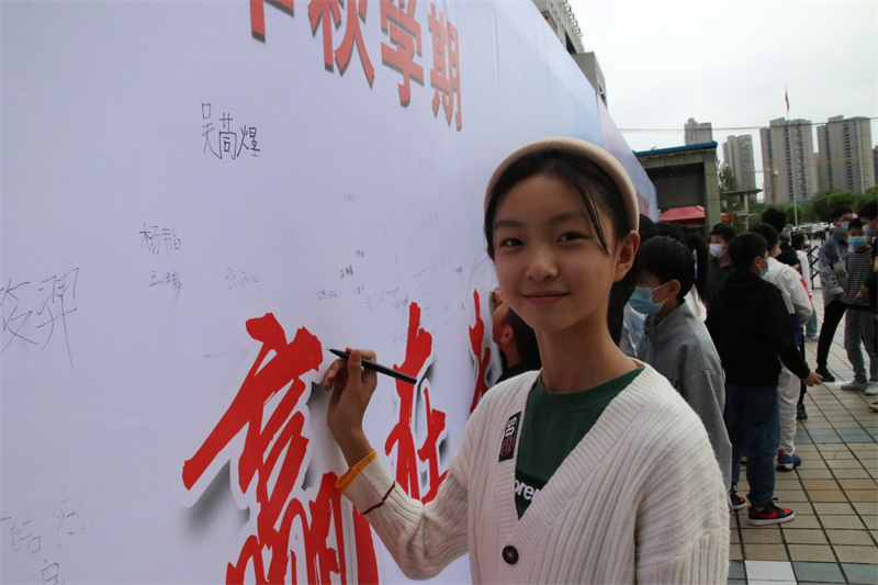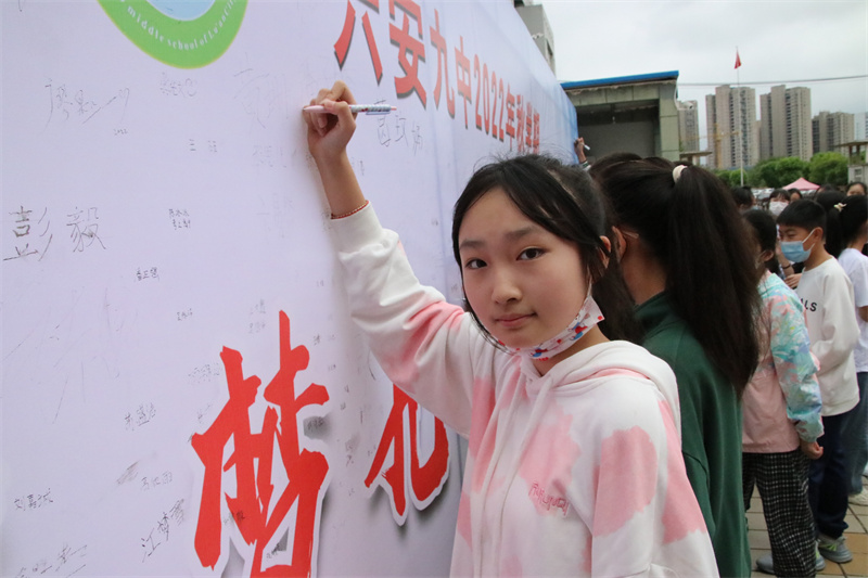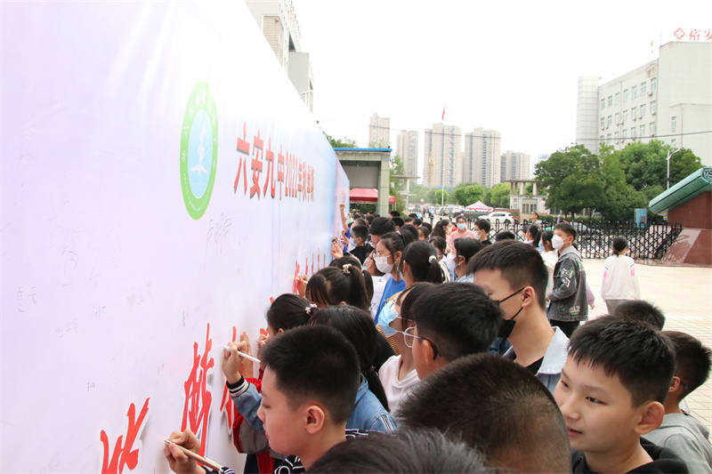 今朝许愿墙,他日成功门。主题班会结束后,各班组织学生排队在留影框前合影留念;走到许愿墙下,面对主题为“筑梦九中,赢在未来”的长墙,同学们纷纷签字许诺:“走入九中,步向成功。”“把自信紧紧握在手里。”“今天的努力,都是在为明天打下基础。”……稚嫩的话语,显露出九中少年的责任和担当。