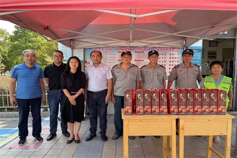 秋风送爽、丹桂飘香。9月9日中秋节当天,六安九中党支部书记、校长李艳、督学王铮及工会主席杨辉带着香甜的月饼慰问在校执勤的安保和后勤人员。向他们致以节日的问候,对他们为全校师生提供日常后勤保障和做出的贡献表示衷心的感谢。期间,李艳校长与后勤职工亲切交谈,询问了他们的工作、生活状况,详细了解了节日期间的值班备勤情况,对坚守一线的后勤职工给予了高度赞扬,充分肯定了后勤职工近年来取得的成绩,希望他们再接再厉,为学校的健康发展提供强有力保障。