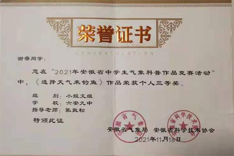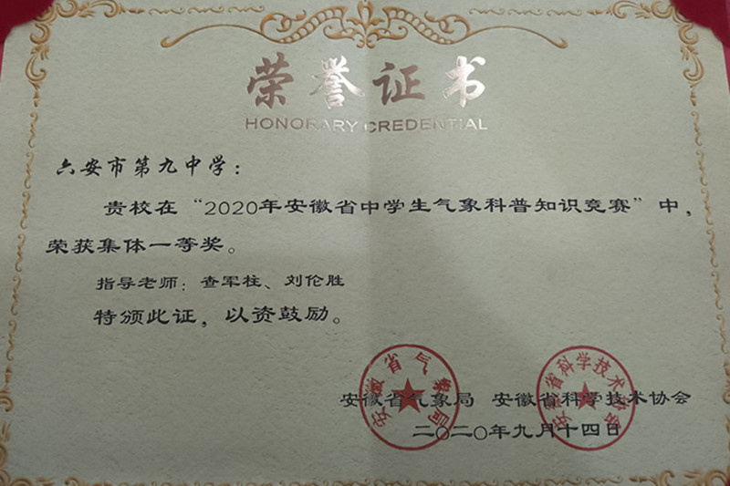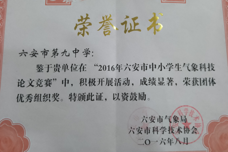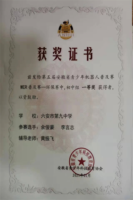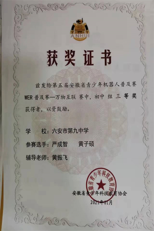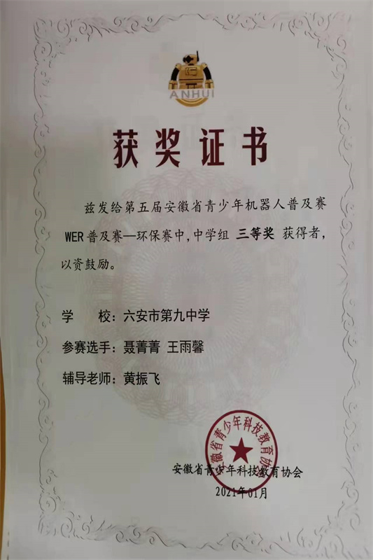 我校积极组织学生参加省市区各级各类科技创新大赛。先后组织学生参加了安徽省“中华魂”(科技托强国梦)主题教育活动、安徽省中学生气象科普知识竞赛、安徽省青少年机器人普及赛等活动,并在活动中取得了优异的成绩。