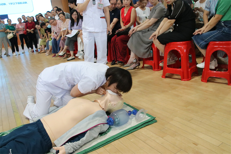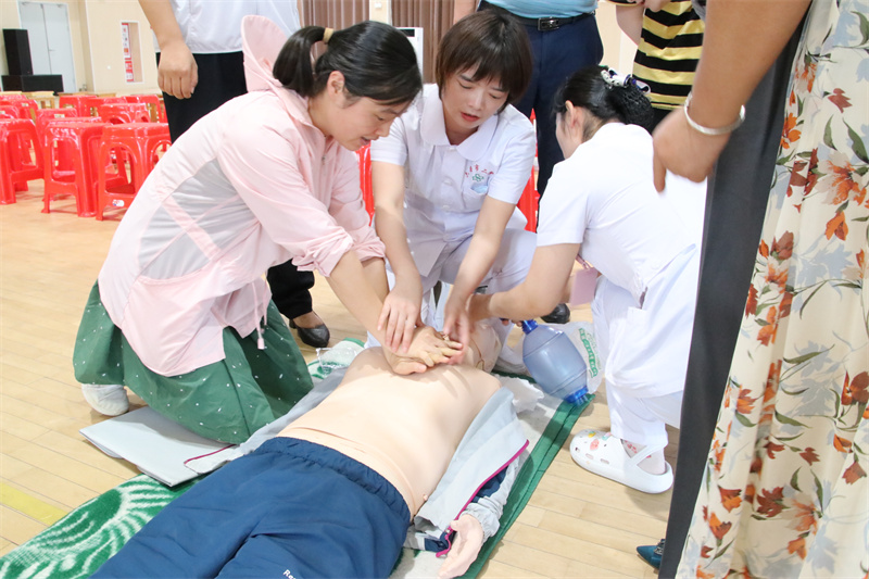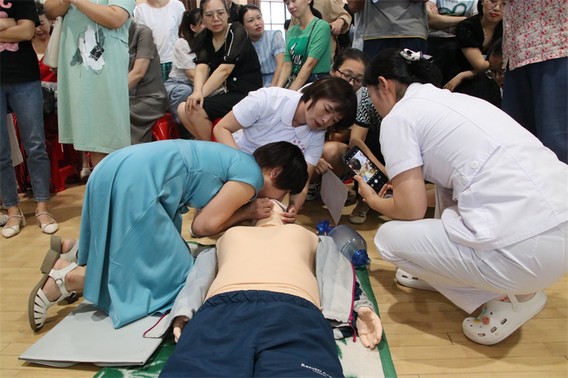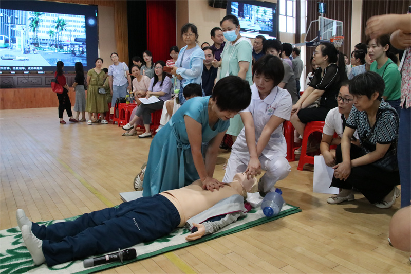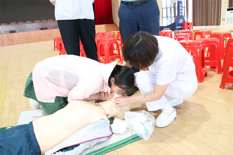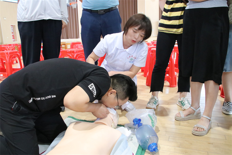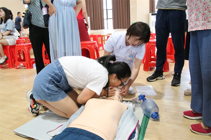 在培训现场,两位专业人员还亲自示范并手把手指导大家开展模拟练习,老师们踊跃参与、主动学习、亲手操作、亲身体验,真正掌握了胸外按压、开放气道、人工呼吸三种基本的急救技巧。
