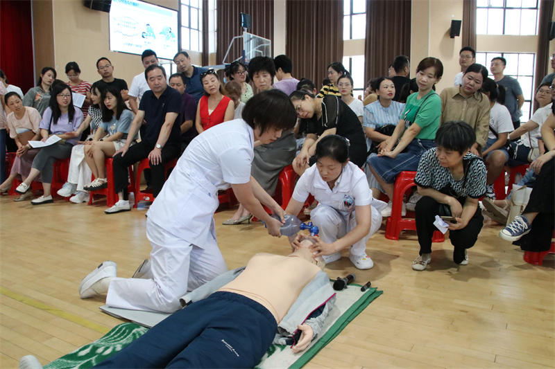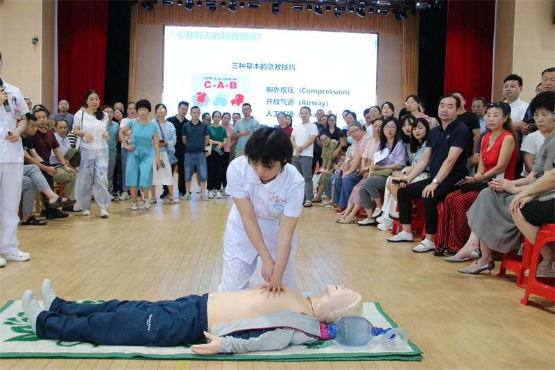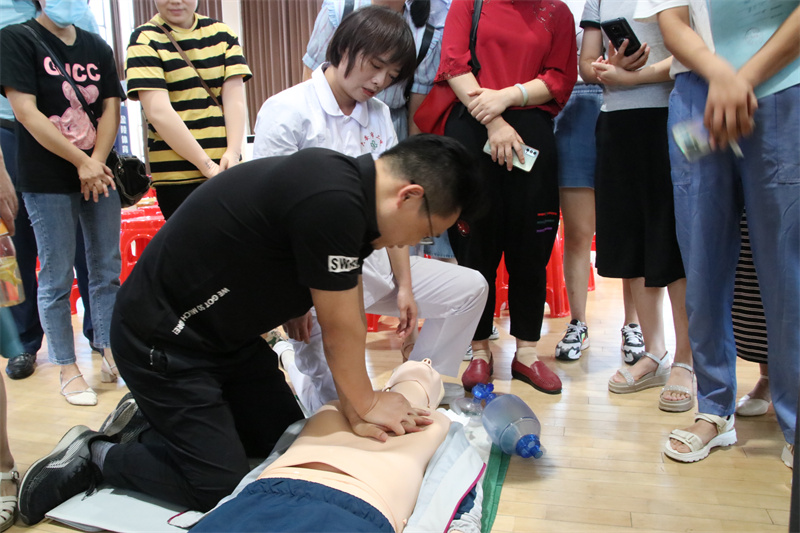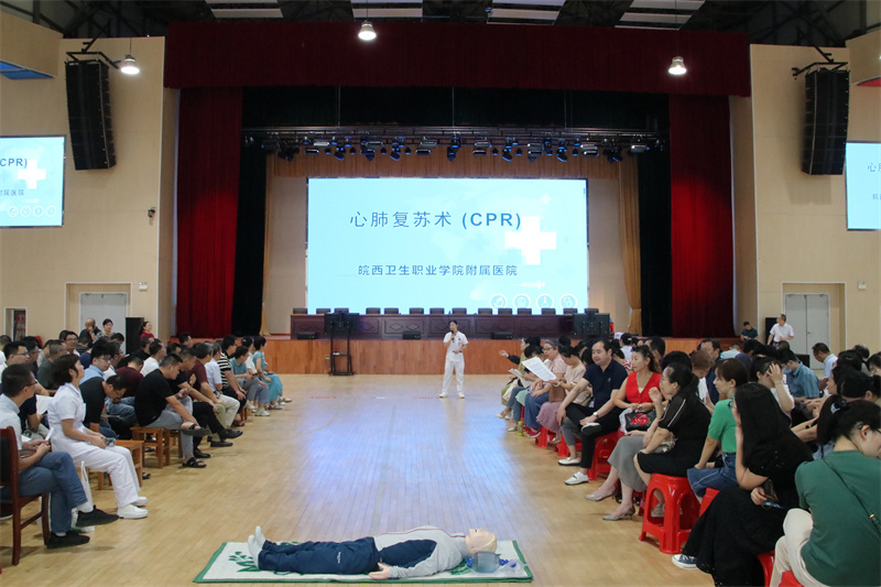 皖西卫生职业学院附属医院临床心理科护士长杨晓辉和急诊医学科护士夏玉婷为老师们做了《心肺复苏术 (CPR)》的专业培训。培训中,两位专业人员结合实际案例,详细讲解了及时施救的重要意义,以及施救的详细步骤和急救要点,使老师们了解并掌握心肺复苏的基本步骤;同时,利用人体模型模拟现场有人突发心跳呼吸骤停,详细演示了如何实施心肺复苏,强调了心肺复苏的适用场景、黄金4——6分钟内对心脏骤停患者的重要性。