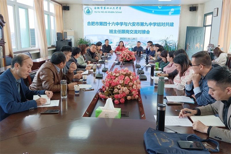 早上八点,班主任跟岗学习对接会在合肥46中六楼会议室举行。合肥46中政教处主任丁志源致以热情洋溢的欢迎辞。丁志源回顾了到六安九中交流时的印象,为六安九中的不断发展送上赞扬和祝福。近年来,两校都步入发展的快车道,助推了当地经济的发展和人才的培养,这得益于两校结对共建的长远战略。丁志源充分肯定了两校间日益密切的交流,希望老师们坦诚地互通有无、互学互鉴。合肥46中政教处副主任王志明介绍了学校的作息时间、近期工作计划等情况,对两校班主任结对工作作出了具体安排。