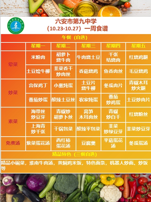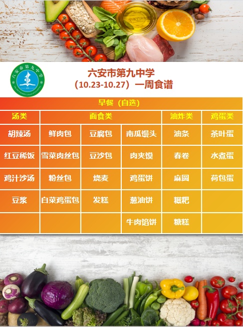 合理的营养是学生发展的基础,而均衡的膳食是摄取营养的唯一途径。我们根据中小学生每日各种营养素的需要量,再结合季节特点,选择八大类食物,安排好容易缺乏的营养素:维生素A、胡萝卜素、钙等的供应;干稀、荤素、粗细、甜咸合理搭配,让学生们在黄金时期健康成长!
