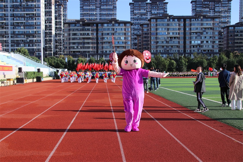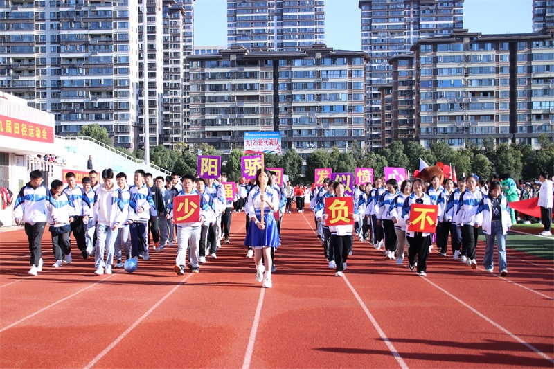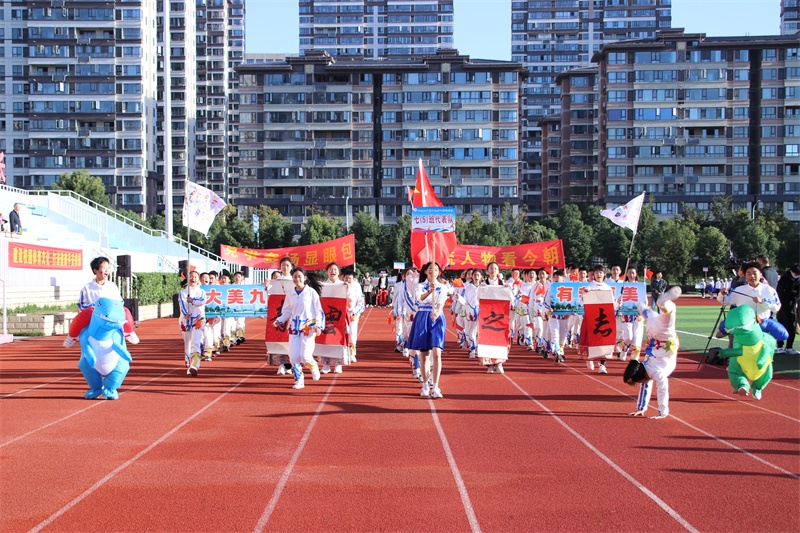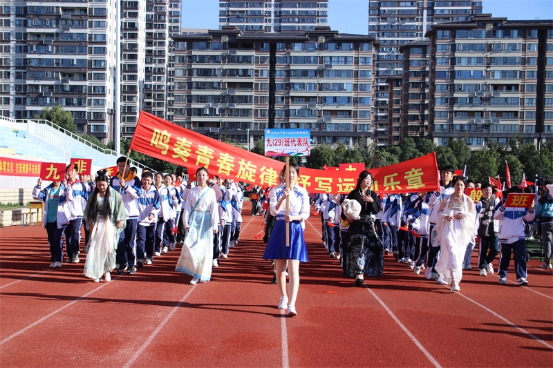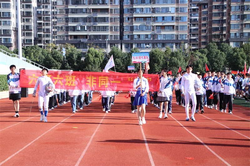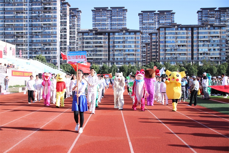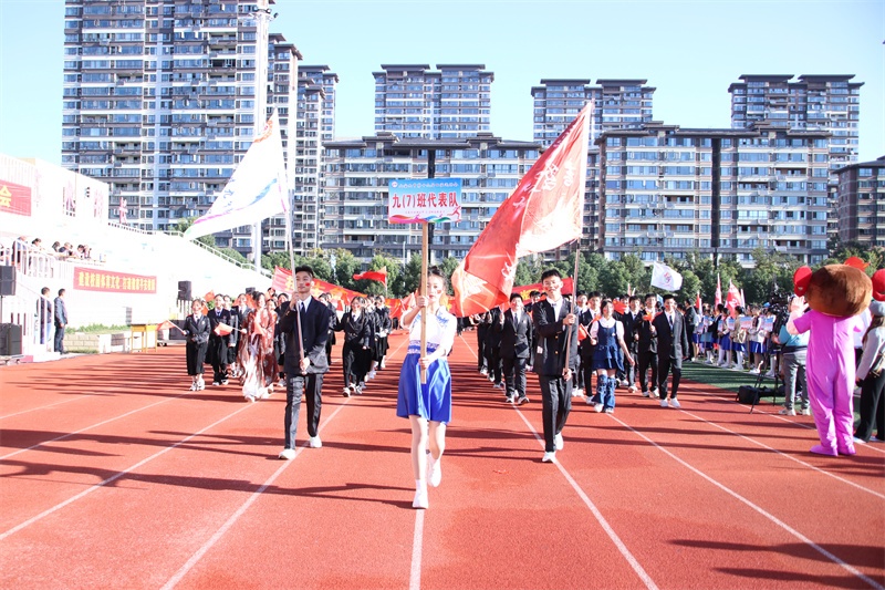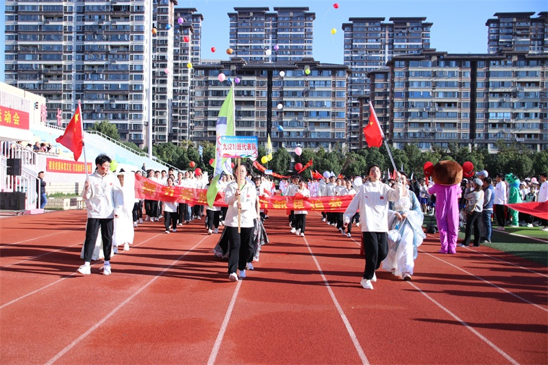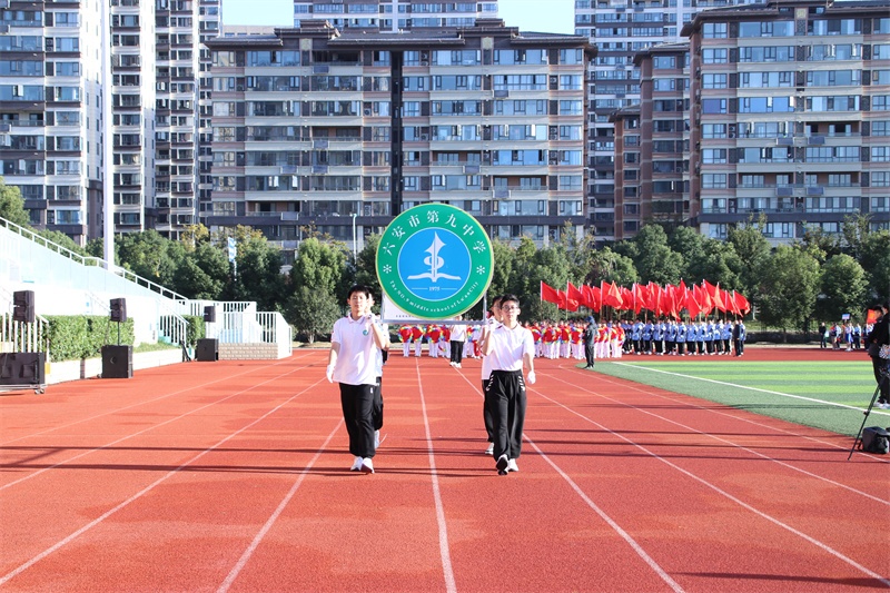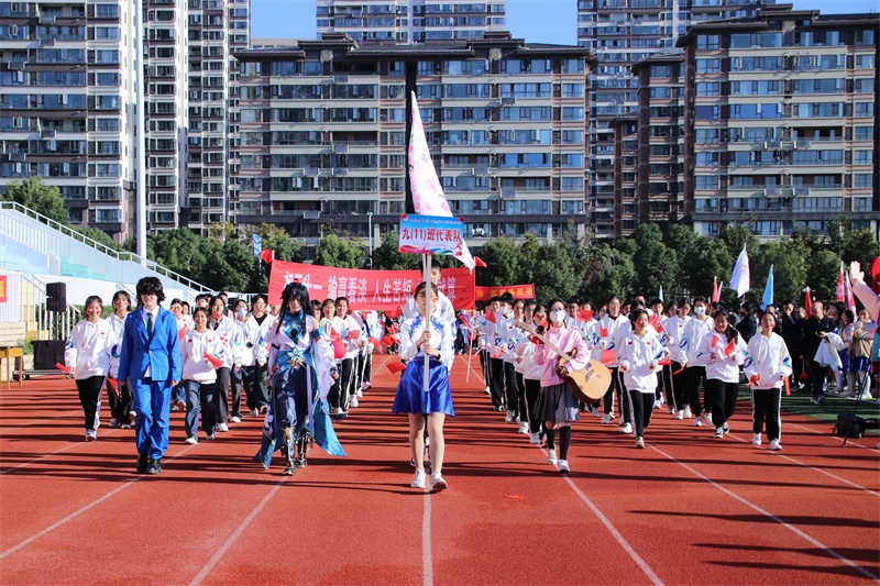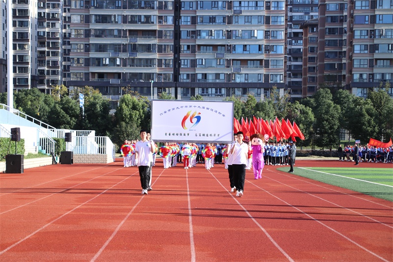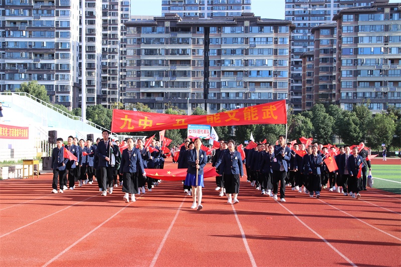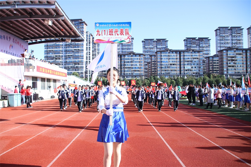 每一位九中人,欣喜满怀,精神饱满。伴随着雄壮有力的《运动员进行曲》,国旗、校徽、吉祥物、会徽、花环、红旗方阵迈着矫健的步伐依次进场。本届运动会,学校设计了吉祥物——“梦梦”。她汇集中国红、祥云、数字“9”等元素于一身,身着紫色加绒运动服,饱含热情,充满活力地叙说着“大美九中梦”的愿景。九中师生善学善用,力臻卓越,追逐梦想,参加本届运动会的100个方阵一一走过主席台,接受检阅。各班方阵由班主任带领,踏着整齐的步伐,喊着响亮的口号,无不展示着朝气蓬勃、健康向上的精神风貌。街舞、击剑、拉丁舞,舞龙狮,形式多样;汉服、运动服、玩偶服,个性十足。激情的入场式充分展现了九中学子独具慧心的无限创意和朝气蓬勃的青春风采。
