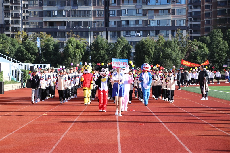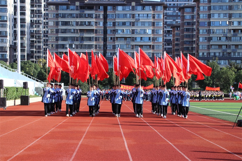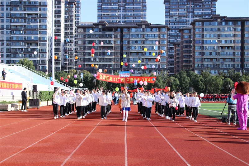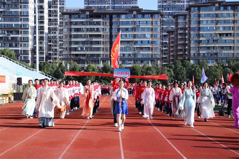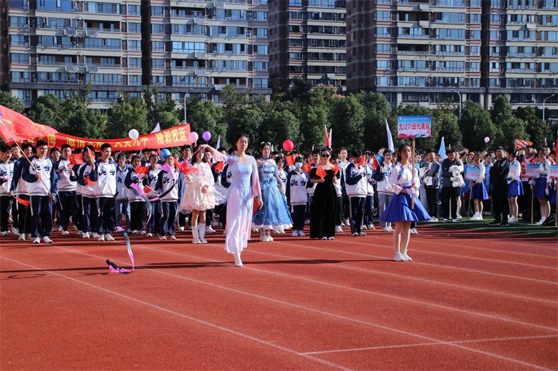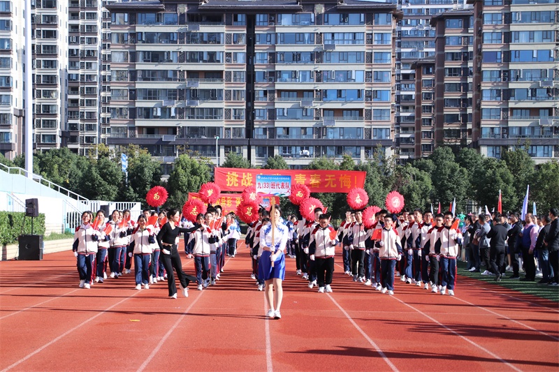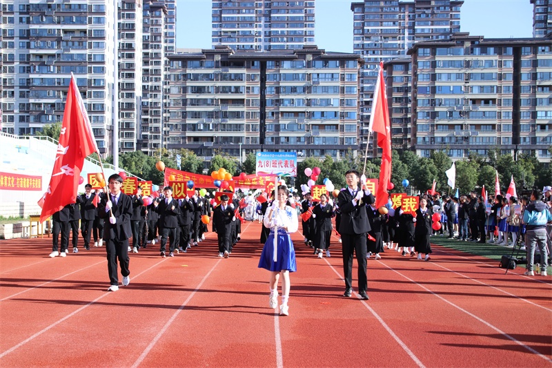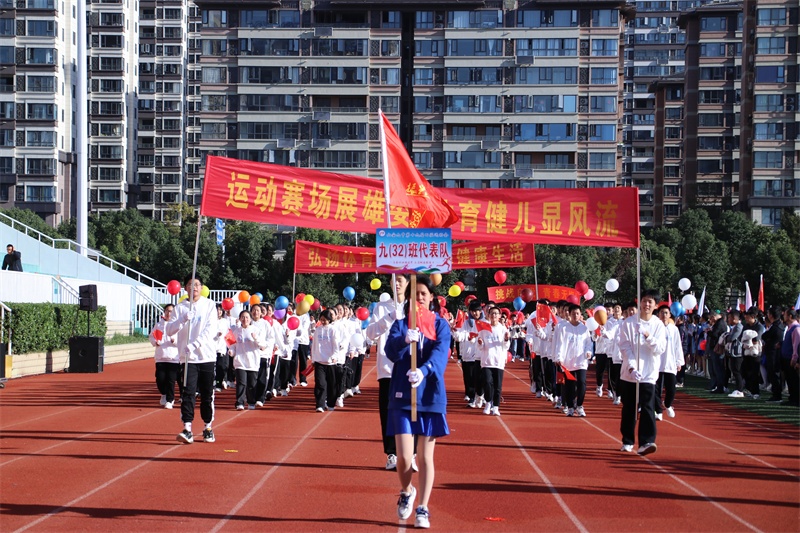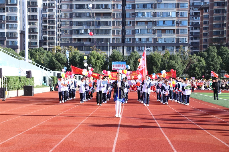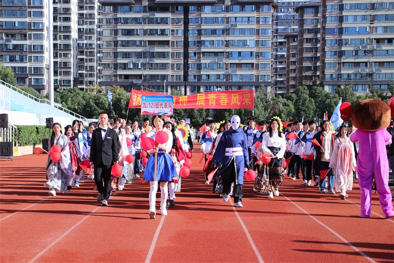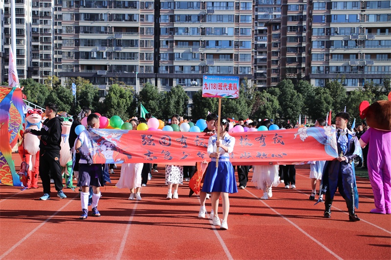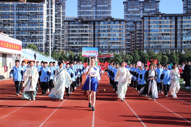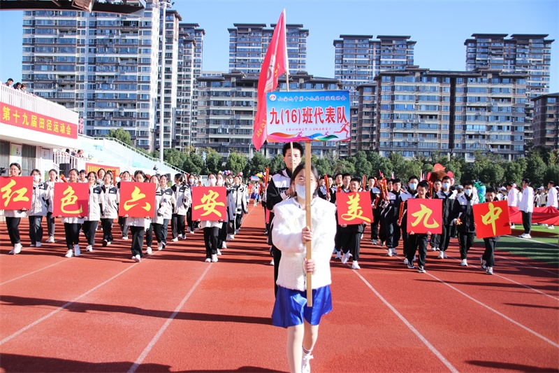 每一位九中人,欣喜满怀,精神饱满。伴随着雄壮有力的《运动员进行曲》,国旗、校徽、吉祥物、会徽、花环、红旗方阵迈着矫健的步伐依次进场。本届运动会,学校设计了吉祥物——“梦梦”。她汇集中国红、祥云、数字“9”等元素于一身,身着紫色加绒运动服,饱含热情,充满活力地叙说着“大美九中梦”的愿景。九中师生善学善用,力臻卓越,追逐梦想,参加本届运动会的100个方阵一一走过主席台,接受检阅。各班方阵由班主任带领,踏着整齐的步伐,喊着响亮的口号,无不展示着朝气蓬勃、健康向上的精神风貌。街舞、击剑、拉丁舞,舞龙狮,形式多样;汉服、运动服、玩偶服,个性十足。激情的入场式充分展现了九中学子独具慧心的无限创意和朝气蓬勃的青春风采。