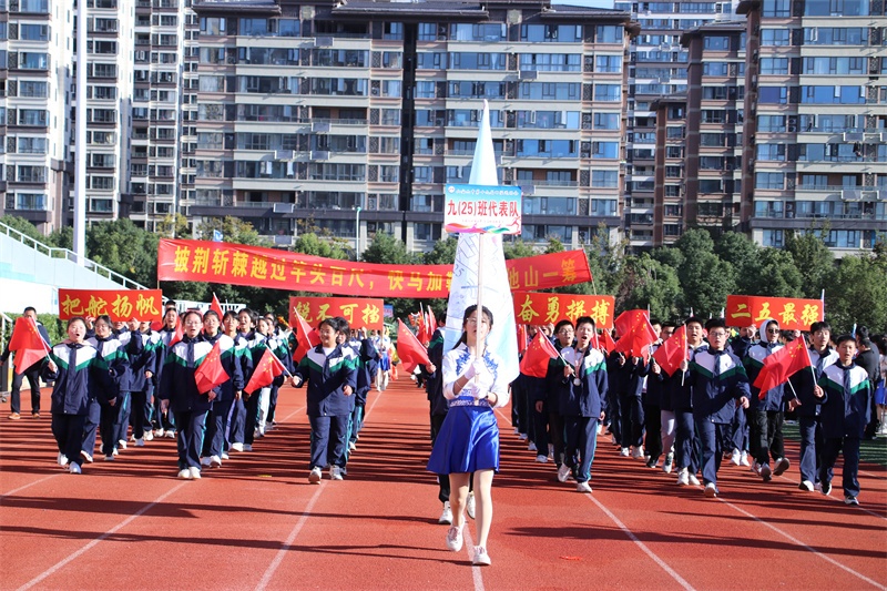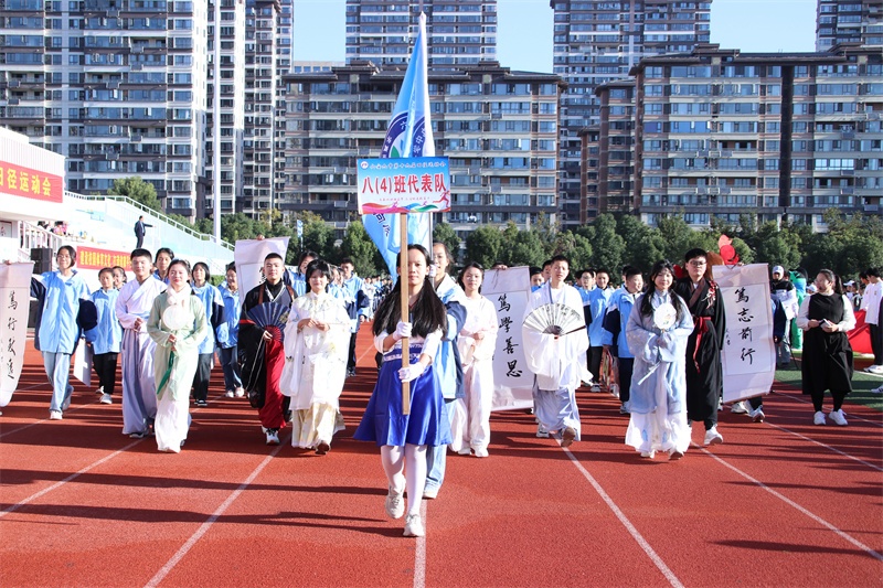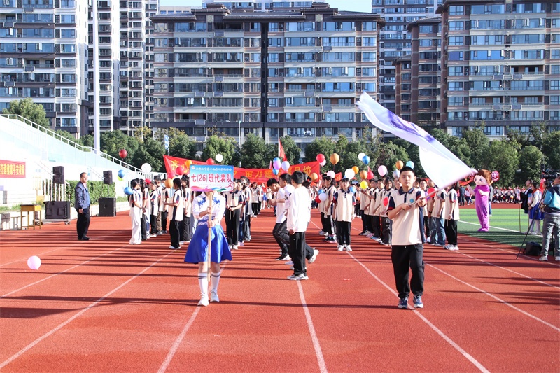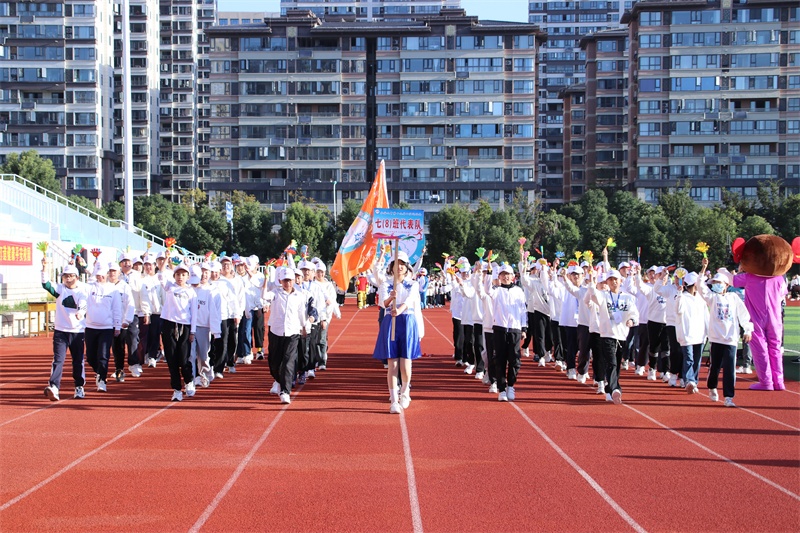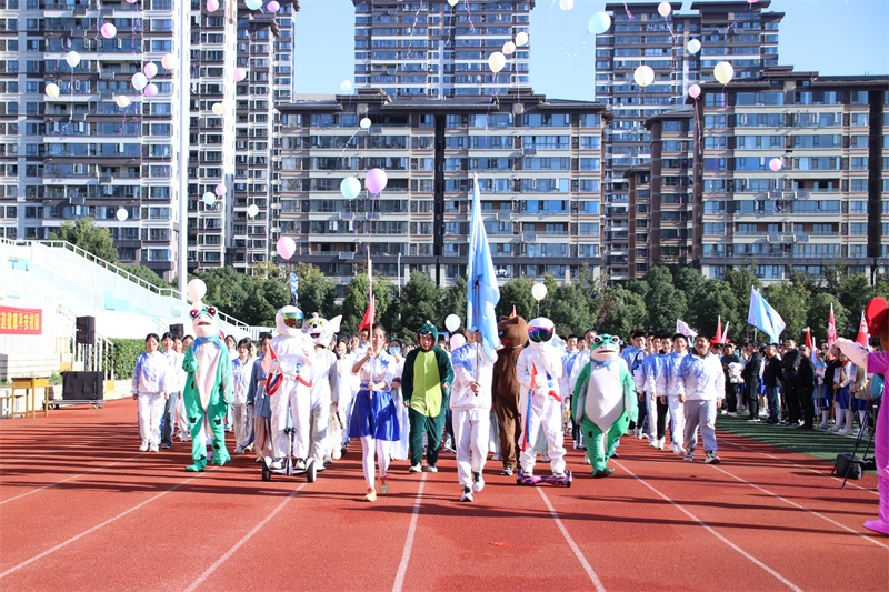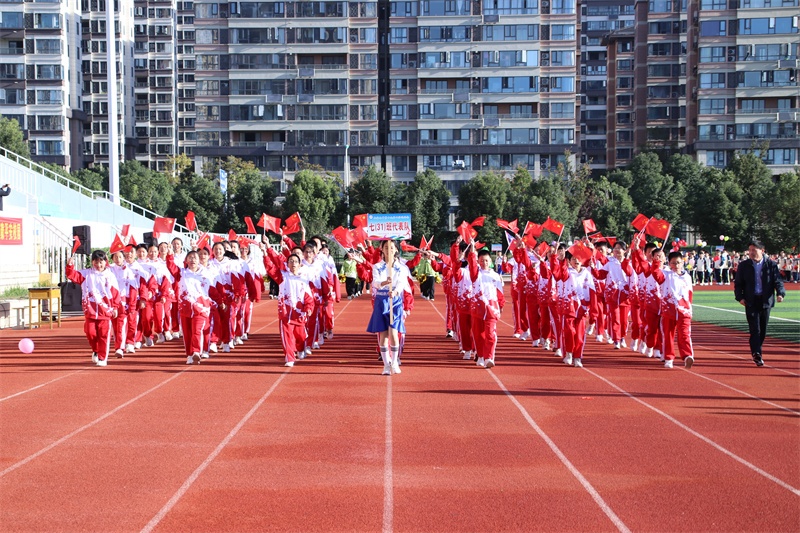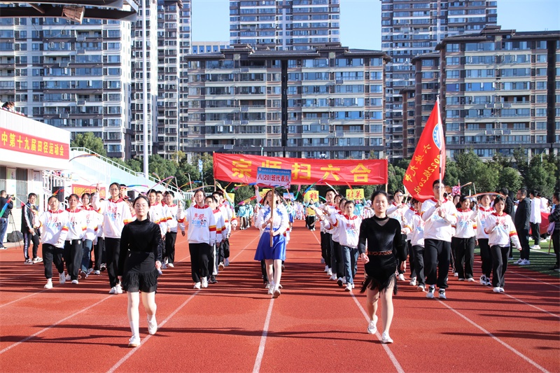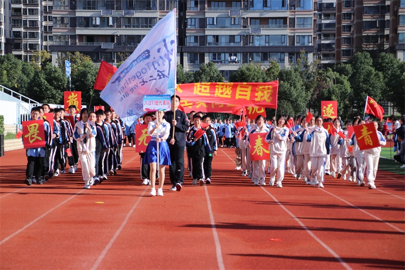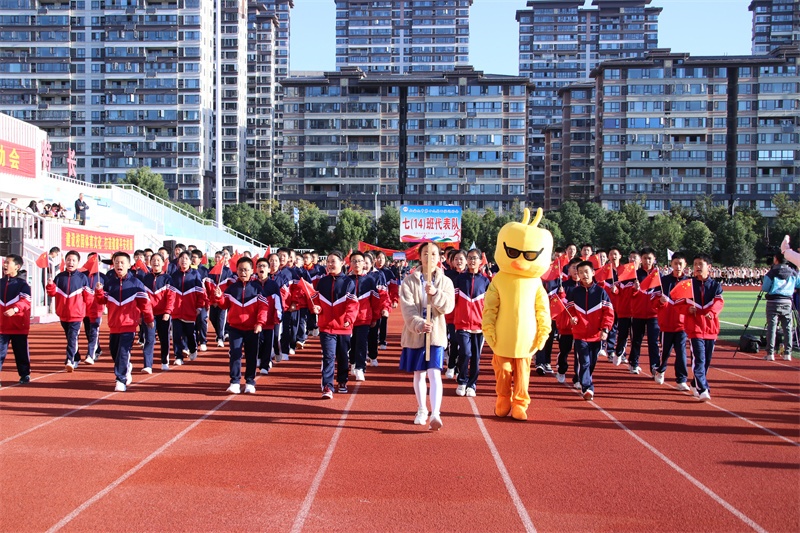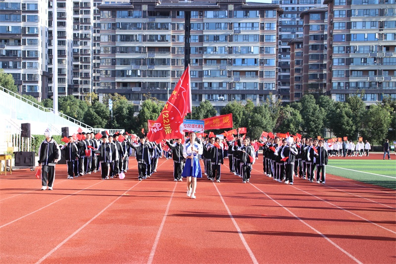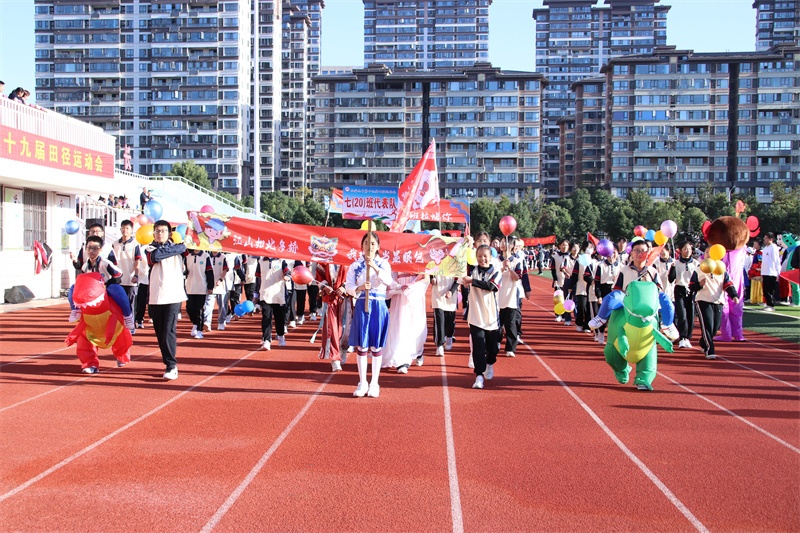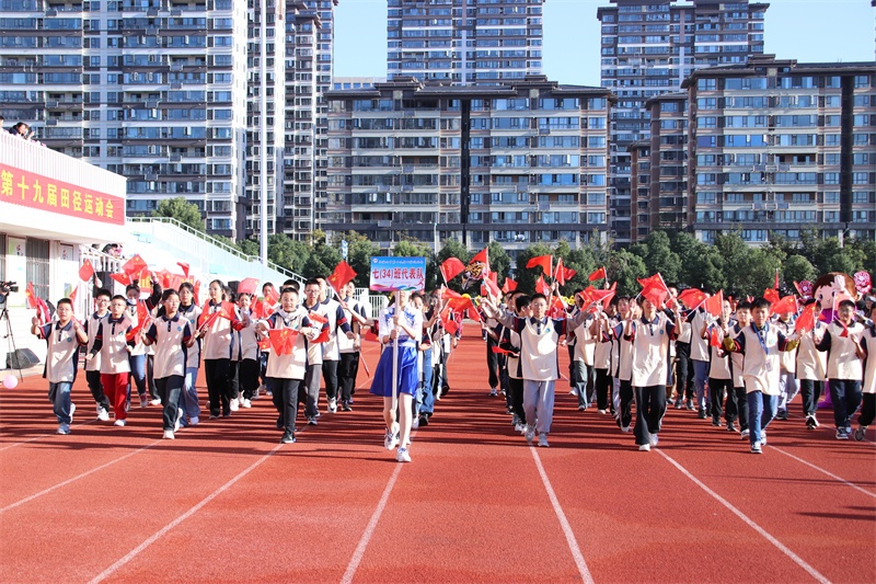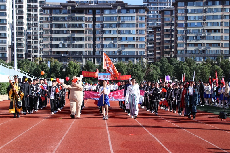 每一位九中人,欣喜满怀,精神饱满。伴随着雄壮有力的《运动员进行曲》,国旗、校徽、吉祥物、会徽、花环、红旗方阵迈着矫健的步伐依次进场。本届运动会,学校设计了吉祥物——“梦梦”。她汇集中国红、祥云、数字“9”等元素于一身,身着紫色加绒运动服,饱含热情,充满活力地叙说着“大美九中梦”的愿景。九中师生善学善用,力臻卓越,追逐梦想,参加本届运动会的100个方阵一一走过主席台,接受检阅。各班方阵由班主任带领,踏着整齐的步伐,喊着响亮的口号,无不展示着朝气蓬勃、健康向上的精神风貌。街舞、击剑、拉丁舞,舞龙狮,形式多样;汉服、运动服、玩偶服,个性十足。激情的入场式充分展现了九中学子独具慧心的无限创意和朝气蓬勃的青春风采。