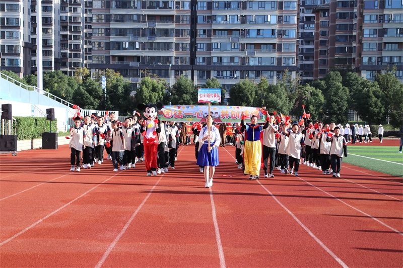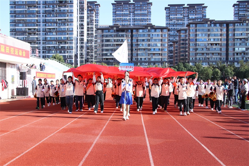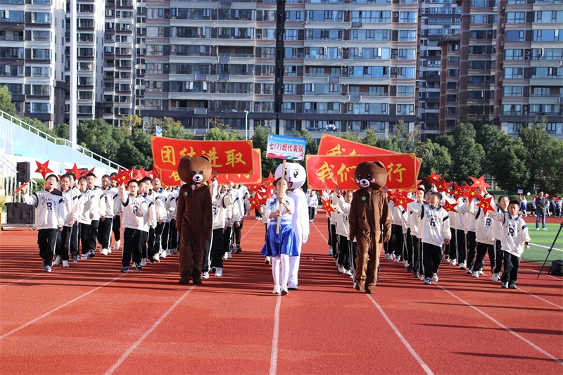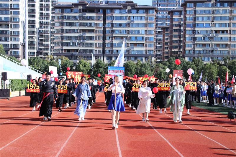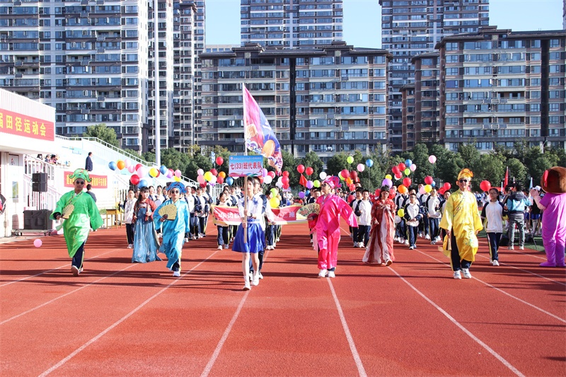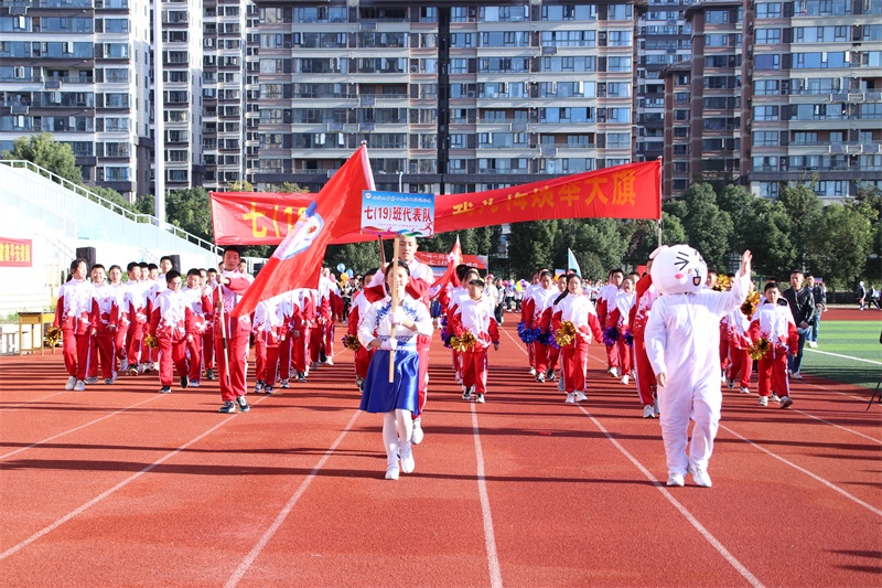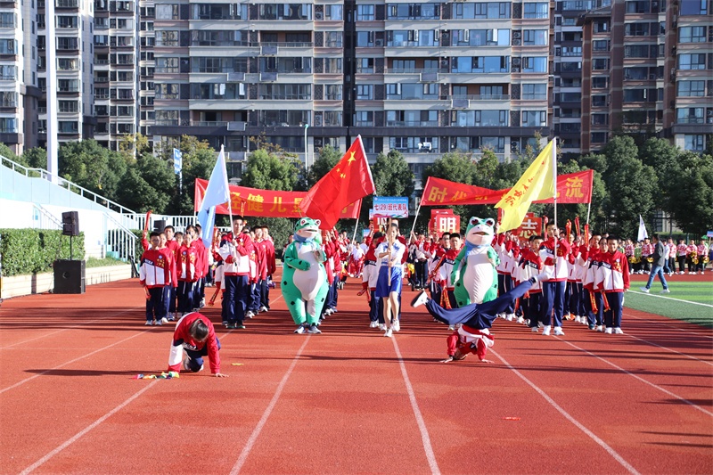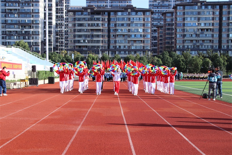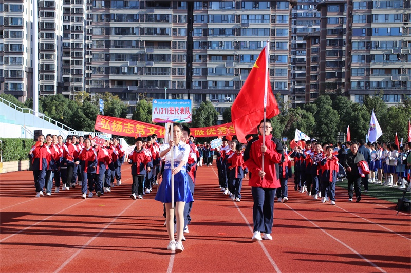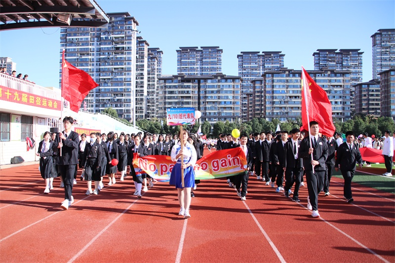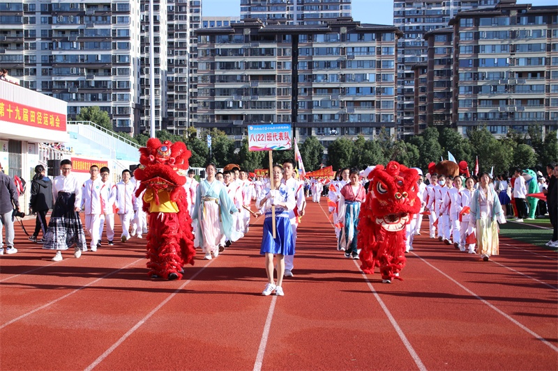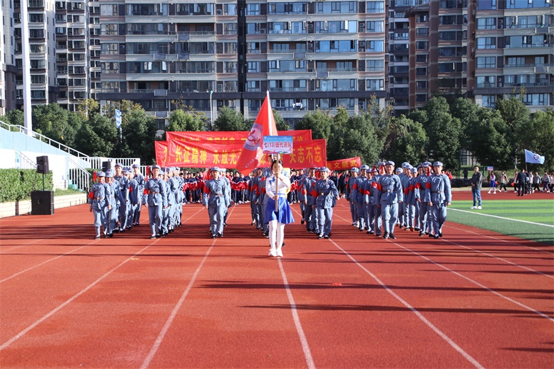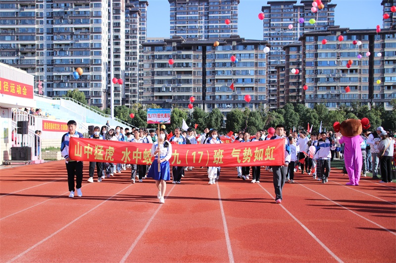 每一位九中人,欣喜满怀,精神饱满。伴随着雄壮有力的《运动员进行曲》,国旗、校徽、吉祥物、会徽、花环、红旗方阵迈着矫健的步伐依次进场。本届运动会,学校设计了吉祥物——“梦梦”。她汇集中国红、祥云、数字“9”等元素于一身,身着紫色加绒运动服,饱含热情,充满活力地叙说着“大美九中梦”的愿景。九中师生善学善用,力臻卓越,追逐梦想,参加本届运动会的100个方阵一一走过主席台,接受检阅。各班方阵由班主任带领,踏着整齐的步伐,喊着响亮的口号,无不展示着朝气蓬勃、健康向上的精神风貌。街舞、击剑、拉丁舞,舞龙狮,形式多样;汉服、运动服、玩偶服,个性十足。激情的入场式充分展现了九中学子独具慧心的无限创意和朝气蓬勃的青春风采。