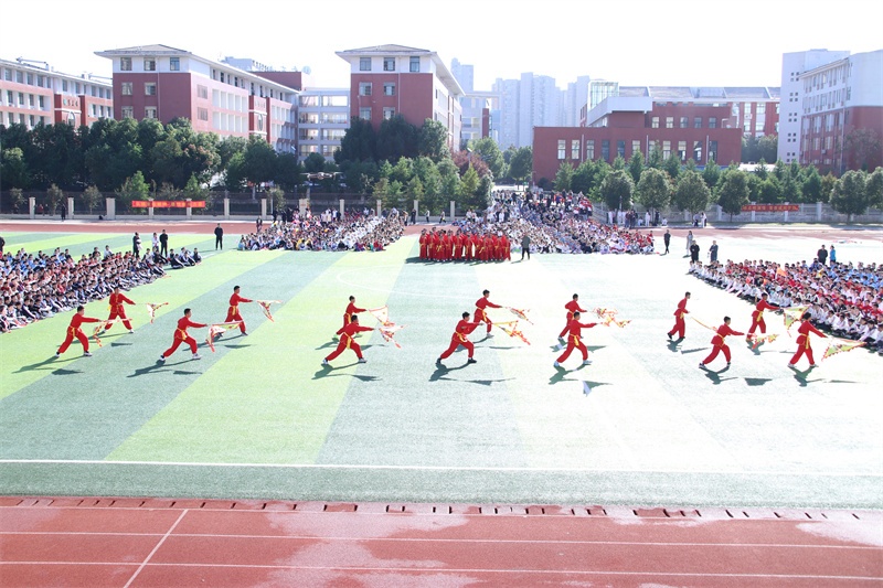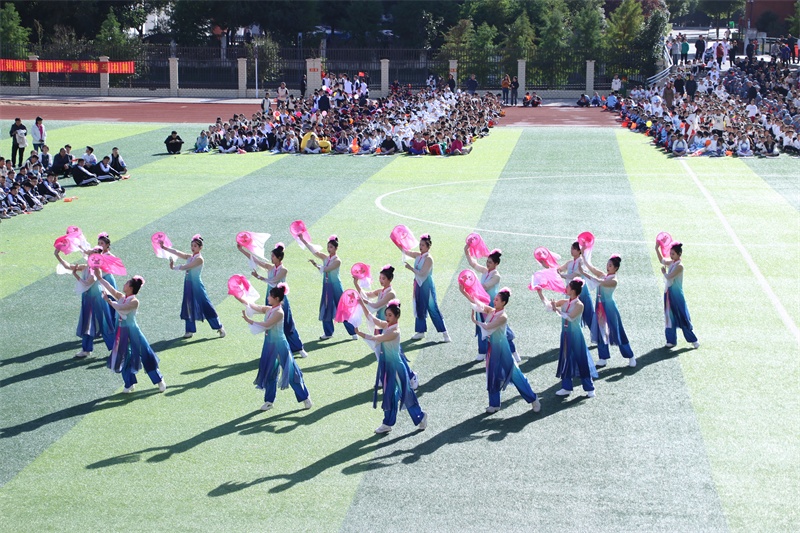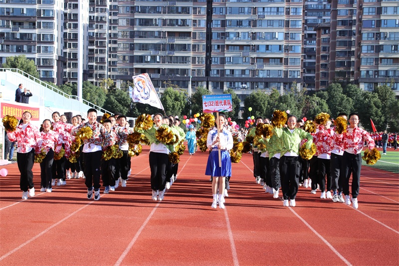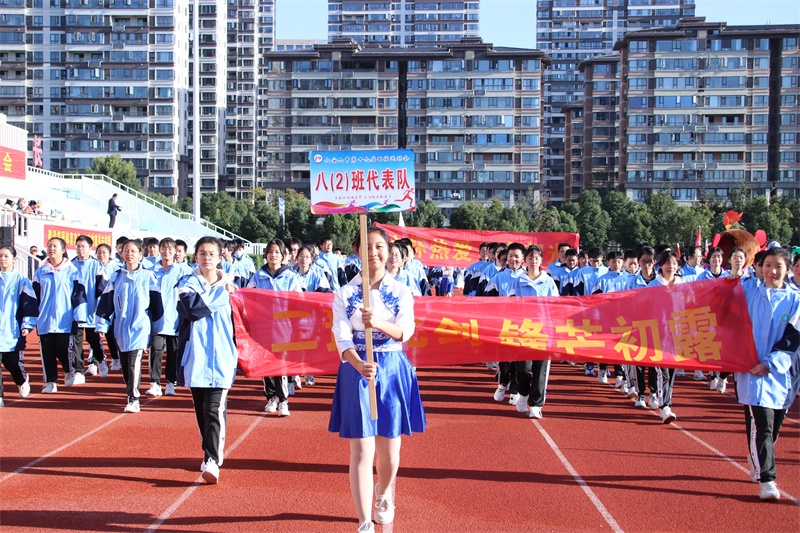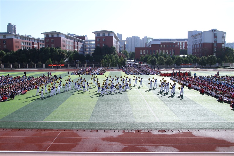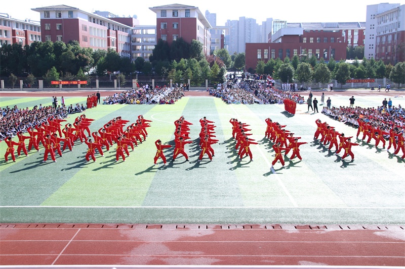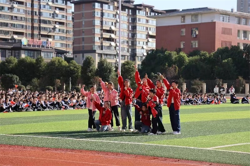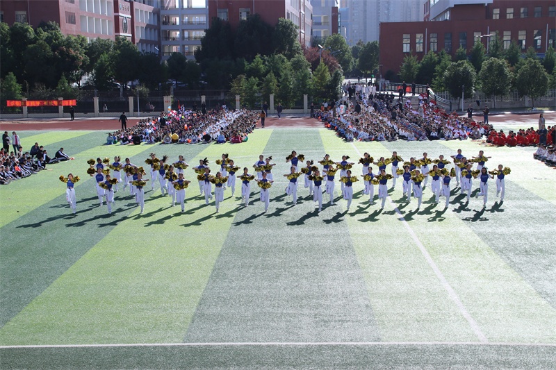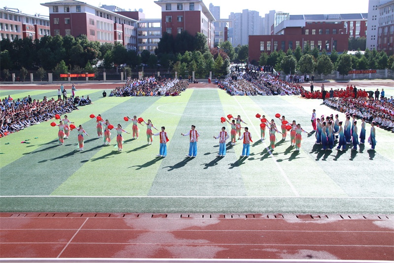 传统文化、运动健身,强国复兴,主题纷呈,本届运动会文体表演倾情上演。健美操《舞动青春》奔放跃动,每一个动作都传递着青春的活力,每一个节拍都释放青春的激情。目光所至,皆是华夏,五星闪耀,皆为信仰。一声《雪龙吟》,充盈着九中少年腾飞云上的鸿鹄之志。传承优秀传统文化的皖西庐剧社团的小演员们带来了《庐剧花腔小调联唱》,焕发出耀眼的光芒,绽放出绚丽的色彩。少年强则国强,一曲《少年中国说》,九中学子唱出志笃少年强国有我的铿锵誓言,唱响心中梦想豪迈的战歌。音乐组老师和庐剧社团的同学们表演的歌伴舞《再一次出发》,传递出九中师生的豪迈与自信,代表了九中师生永不停歇的步伐和对美好未来的向往。
