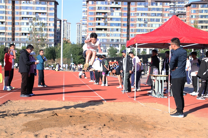激扬的旋律,矫健的身姿,九年级运动健儿们箭一般飞向百米赛道的终点。他们不断挑战自我,不断超越自我,用速度诠释着青年的自信和阳光。跳远运动员们,个个使出浑身解数,从手臂预摆身体下蹲,到向前腾空跳起,每个动作都英姿飒爽,每次跳跃都活力四射,用距离诠释了青春的活力和精彩。