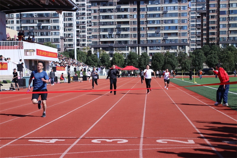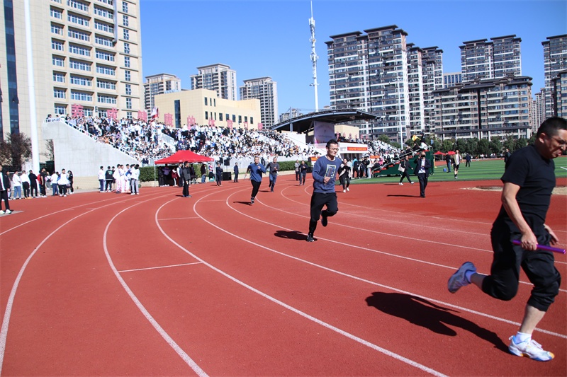 蔚蓝的天空与红色的跑道交相辉映,舞动的身影与激情的呐喊相加成章。教师组4×100米接力比赛率先打响了本届运动会第一枪。起跑、赶超、冲刺,老师们步履如飞、势如破竹。小小的接力棒,凝结着团结和默契,传递着无畏与拼搏。