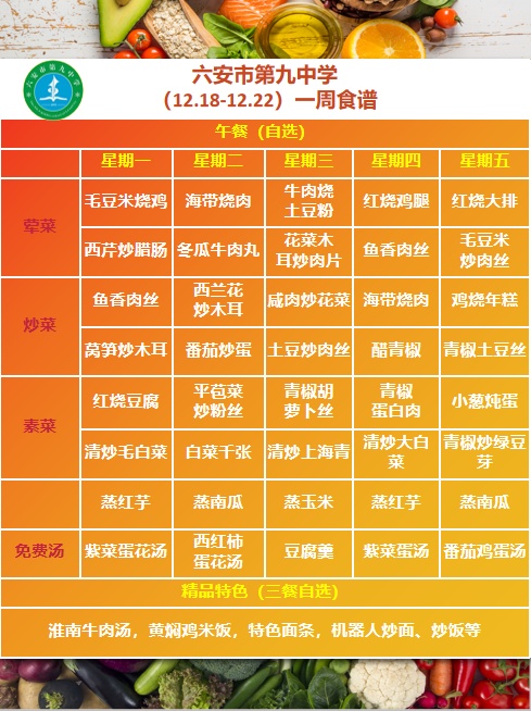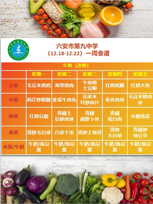 合理的营养是学生发展的基础,而均衡的膳食是摄取营养的唯一途径。我们根据中小学生每日各种营养素的需要量,再结合季节特点,选择八大类食物,安排好容易缺乏的营养素:维生素A、胡萝卜素、钙等的供应;干稀、荤素、粗细、甜咸合理搭配,让学生们在黄金时期健康成长!