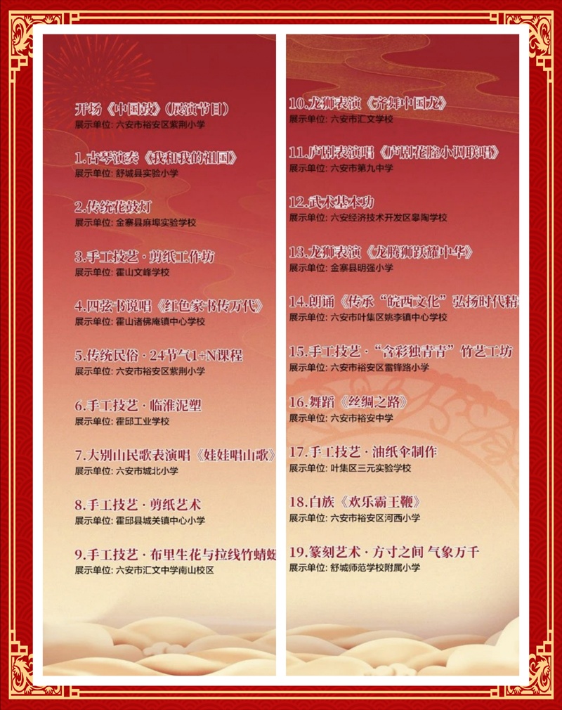 本次活动,由六安市文化和旅游局、六安市教育局(六安市体育局)主办,六安市文化馆、六安市直关工委承办。经过层层选拔,最终有来自六安四县三区的19支队伍参加本次展示活动。经过激烈角逐,我校参演的庐剧表演唱《庐剧花腔小调联唱》在19个优秀作品中力挫群雄,脱颖而出,拔得头筹,喜获一等奖。
