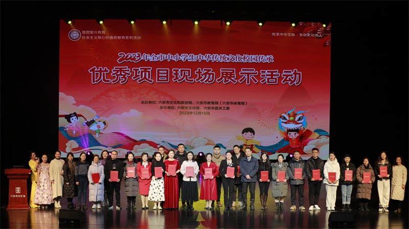 12月15日,2023年全市中小学生中华传统文化校园传承优秀项目现场展示活动隆重举行,六安九中参演的节目——庐剧表演唱《庐剧花腔小调联唱》荣获一等奖。
