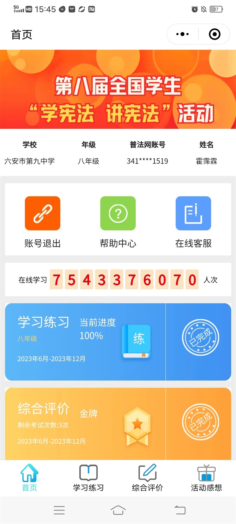11月上旬,我校积极组织全校学生参加了第八届全国学生“学宪法 讲宪法”学习与答题活动。各年级学生积极参与,主动学习,截止目前,全员完成在线学习、练习与综合评价活动,参与率达到100%。